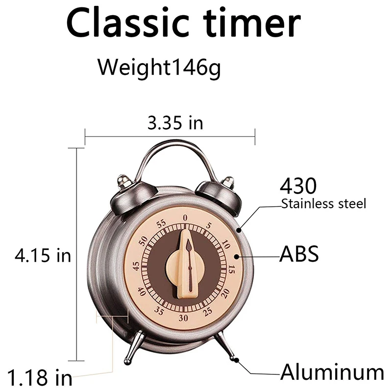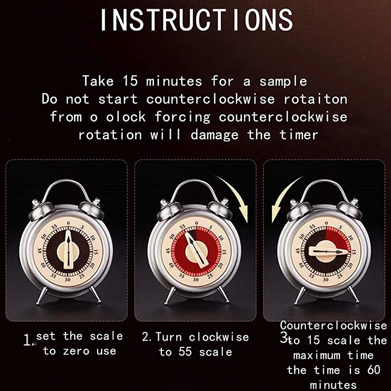 NOTIES: не начинайте вращение против часовой стрелки с 0 часов, если вращение против часовой стрелки повредит таймер. Ниже показано, как использовать его 1. Установите масштаб до нуля перед использованием. 2. Поверните по часовой стрелке до 55 шкал 3. Против часовой стрелки до 15 шкал максимальное время таймера составляет 60 минут. Этот тип таймера механический. Он поворачивается по часовой стрелке до 55 весов для функции намотки, и часы будут иметь 3-5 секунд напоминания о звонке.