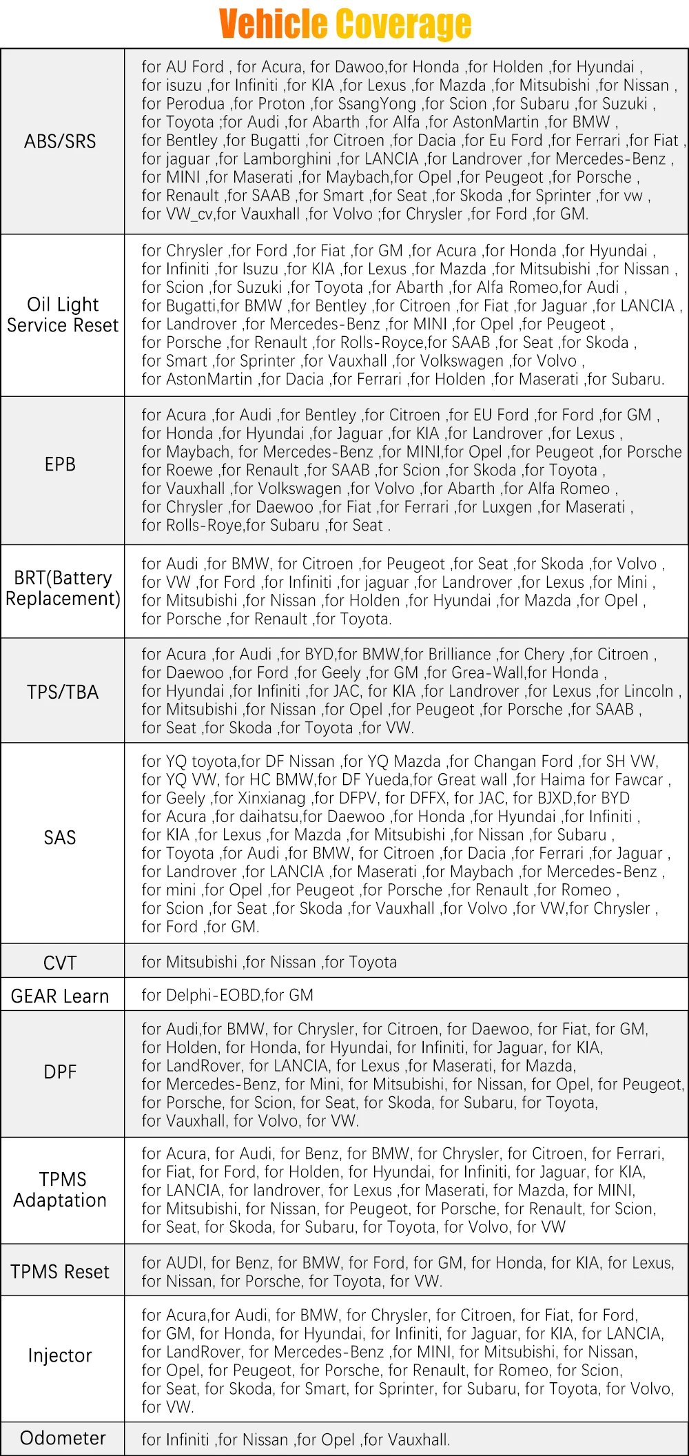 Для Acura, для Audi, для Bentley, для Citroen, для EU Ford, для Ford, для GM, для Honda, для Hyundai, для Jaguar, для KIA, для Landrover, для Lexus, для Maybach, для Mercedes-Benz, для MINI, для Opel, для Peugeot, для Porsche, для Roewe, Для Renault, для SAAB, для Scion, для Skoda, для Toyota, для Vauxhall, для Volkswagen, для Volvo, для Abarth, для Alfa Romeo, для Chrysler, для Daewoo, для Fiat, для Ferrari, для Luxgen, для Maserati, для Rolls-Roye, для Subaru, для Seat