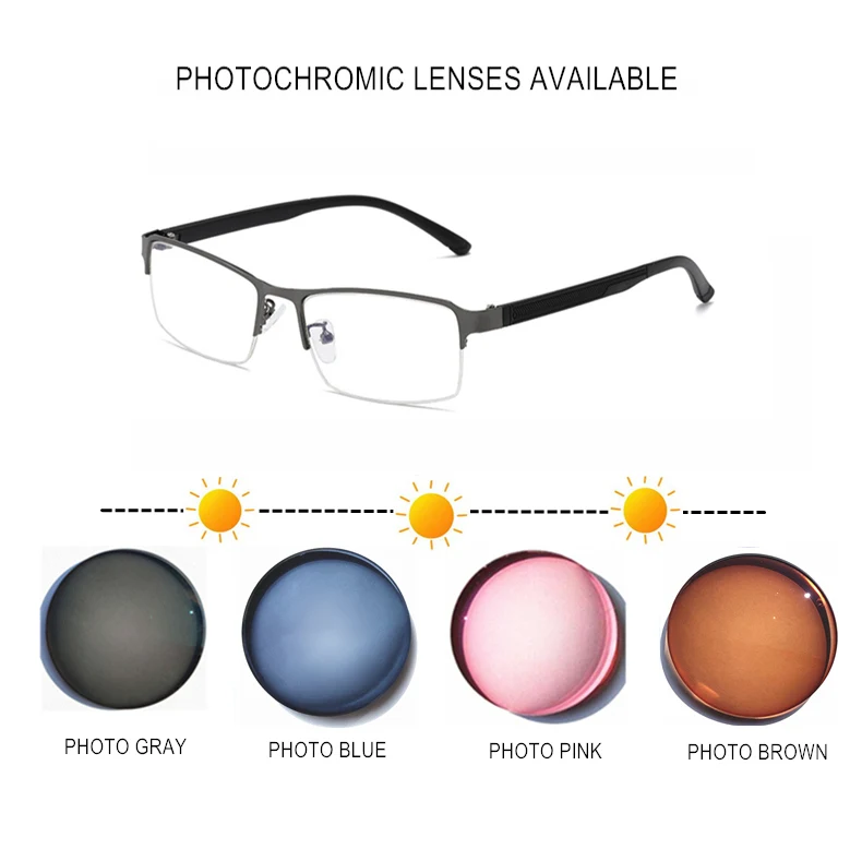 О фотохромные линзы, они будут прозрачными и бесцветными в помещении или в темных местах, но они изменят цвет на открытом воздухе или на солнце, чтобы защитить ваши глаза от сильного светильник.