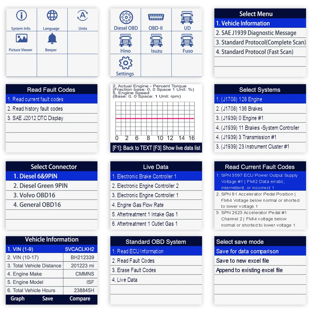 Работает на большинстве грузовиков с автомобильным покрытием J1708 и J1939 plus OBD2 и охватывает Hino, Mishubishi Fuso, Isuzu и Nissan UD коммерческие транспортные средства. С 1992 поддерживает SAE J1850PWM, SAE J1850 VPW, IS0 14230-4, IS0 9141-2,IS0 15765-4, SAE J1708, SAE J1939, OBDII сканирует и диагностирует коды неисправностей с определением кода в двигателе, трансмиссии, тормозе ABS и кластере инструментов или управлении корпусом.