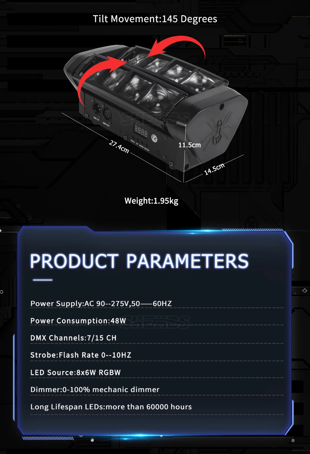 3. Светодиодный источник: светодиодный 8 × 6 Вт RGBW [2 глаза красного цвета, 2 глаза зеленого цвета, 2 глаза синего цвета, 2 глаза белого цвета]