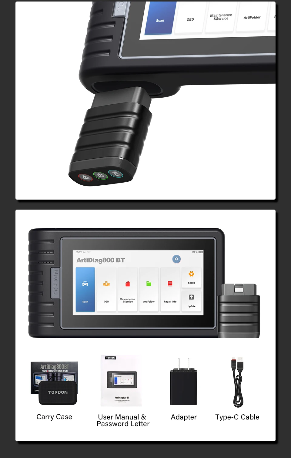 TOPDON ArtiDiag800 BT, системный диагностический инструмент, может получить быстрый доступ ко всем доступным электронным системам, таким как двигатель, трансмиссия, подушка безопасности, ABS, SRS, EPB, иммобилайзер, двери, кондиционер, шлюз и т. Д. И выполните комплексное сканирование на каждом модуле, чтобы узнать, какая система неисправности песка извлечения DTCs связанных. √ Информация о версии: прочитайте информацию о текущей версии ECU; √ Чтение кода неисправностей: чтение DTCs в памяти ECU и быстрое определение причины проблем с транспортным средством; √ Четкий код неисправности: Очистите DTCs памяти ECU проверенной системы; √ Поток данных считывания: считывание и отображение данных ECU в реальном времени в различных режимах (текст, сигнал и т. д.).