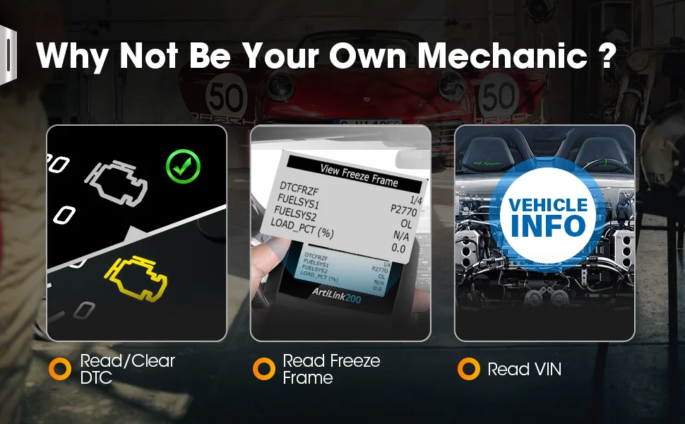 TOPDON Artilink200 с кодами считывания/очистки, контрольный светильник двигателя выключается, проверка состояния готовности I/M, просмотр данных стоп-кадра и получение идентификационного номера транспортного средства, действительно является конечным обязательным кодовым считывателем OBD2 в эффективности и доступности для начинающих, которые ищут быстрое и точное решение частичного двигателя и систем.