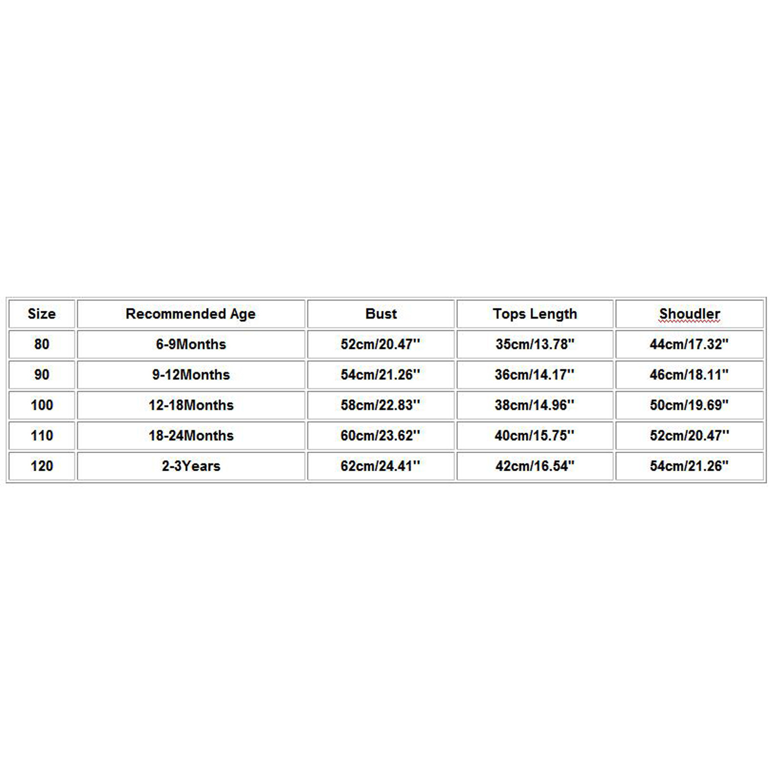 Размеры Рекомендуемый возраст Бюст Длина топа Shoudler 80 От 6 до 9 месяцев 52 см/20,47'' 35 см/13,78" 44 см/17,32" 90 9 to 12months 54 см/21,26'' 36 см/14,17'' 46 см/18,11" 100 12-18Months 58 см/22,83'' 38 см/14,96'' 50 см/19,69" 110 18-24Months 60 см/23,62'' 40 см/15,75'' 52 см/20,47'' 120 2-3Years 62 см/24,41'' 42 см/16,54" 54 см/21,26"
