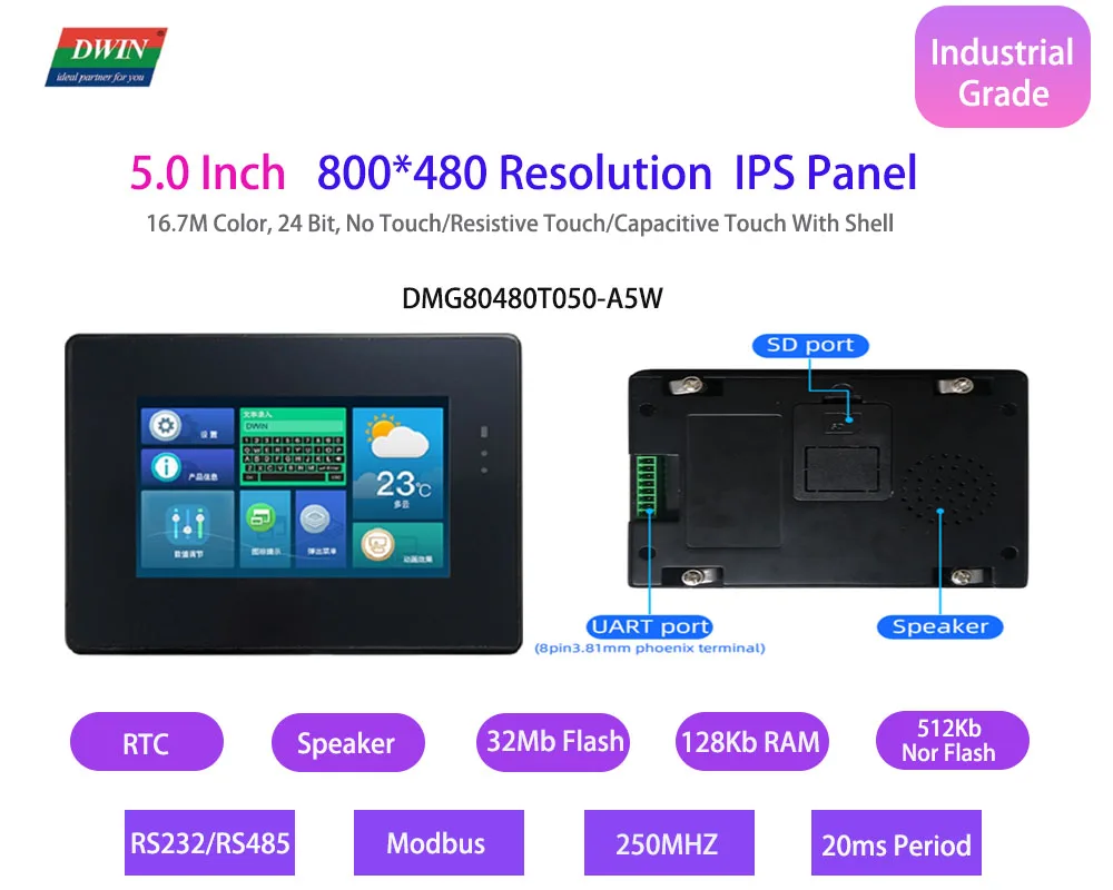 DMG80480T050_A5W-это 5,0 дюймовый Интеллектуальный UART серийный TFT ЖК-дисплей модуль. Разрешение 800*480, IPS панель. Угол обзора 85/85/85/85, 16,7 М Цвет, 24 бит.