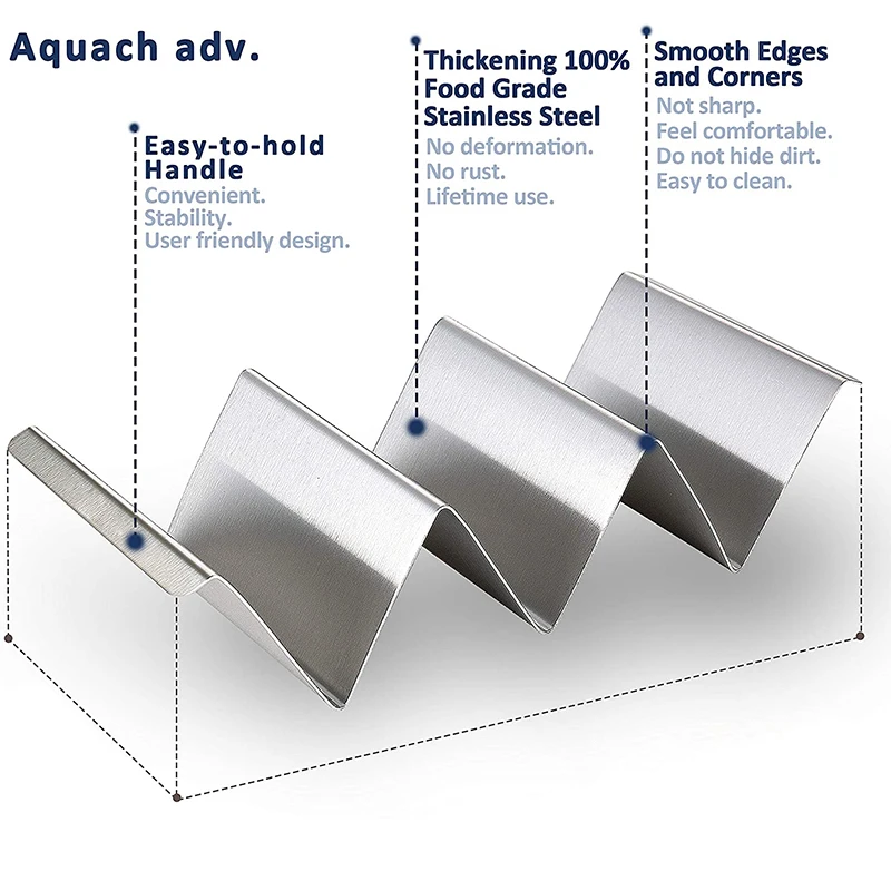 -Изготовлен из пищевого безопасного высококачественного материала из нержавеющей стали. -С большими сервировочными лотками можно легко держать тако. -Также можно использовать для транспортировки Кукуруза в початках или больших овощей на гриле -Отлично подходит для хранения и гриля.