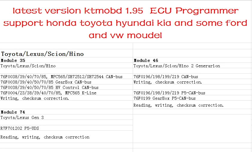 Это новый OBD ЭБУ программист и коробка передач инструмент обновления питания с J2534 OBD коннектором Список функций: 1. Чтение данных чипа. 2. Чтение и запись данных ECU. 3. Считывание данных коробки передач и т. Д. На высокой скорости 4. Виртуальное чтение, письмо, коррекция чековой суммы .. Последний KTMOBD ECU программист V1.20 обновление: Модуль 66 (Новый) Honda Bosch PGM-FI (Bosch EDC17CP06/EDC17CP16/2 Мб) Запись, коррекция контрольной суммы. PGM-FI (Bosch EDC17CP50/4MB) [разблокирован] PGM-FI (Bosch EDC17C58/4MB) [разблокирован] PGM-FI (Bosch EDC17C72/2,5 MB) [разблокирован] PGM-FI (Bosch MED17.9.3/4MB) [разблокирован] PGM-FI (Bosch ME17.9.55/1,5 MB) [разблокирован] Запись после разблокировки с модулем 53 или 71, коррекция контрольной суммы. Модуль 74 (Новый) Toyota/Lexus Gen 3 R7F701202 P5-UDS коррекция чтения, письма, чековой суммы OBD ЭБУ программист работоспособный ECU и коробка передач Модель: Ford Ford Focus 2/Fiesta/Fusion, Ford Focus 3 2015, Ford Explorer 2016, Ford Kuga 2 2017, Ford MG1 Модуль 20 Ford Focus 2/Fiesta/Fusion (автоматическая передача для области VID) Ford Focus 2: 1.4L, 1.6L Duratec 85/100/115PS (SIM28/29) Ford Focus 2: 1.8L, 2.0L Duratec HE 125/145PS (ESU131/411/418) Ford Focus 2: 1.8L, 2.0L Duratorq Lynx/DW10C (SID202/SID206) Ford Fiesta/Fusion: 1.4L, 1.6L Duratec 85/100PS (SIM210) Ford Focus 2 ST: 2.5L Duratec I5 225PS (ME9.0) Чтение, письмо, коррекция чековой суммы. Ford Kuga 1: 2.5L Duratec I5 200PS (ME9.0) Запись, коррекция контрольной суммы. Модуль 32 Ford Focus 3 2015, Ford Explorer 2016, Ford Kuga 2 2017 Форд фиеста: 1.0L Ecoboost ti 100/125PS [C1BA] (MED17) Ford Focus 3 2015: 1.0L Ecoboost 2015 + GTDI 100/125PS [DA6A] (MED17) Ford Focus 3 2015: 1.5L Ecoboost 2015 + ti 150/180PS [FV6A] (EMS2510/EMS2511) Ford Kuga 2 2017: 1.5L Ecoboost 2015 + ti 150/180PS [FV6A] (EMS2510/EMS2511) Ford Explorer 2016: 3.5L Cyclone V6 Ti-VCT 249/294PS (2016) Ford Mondeo 5: 1.5L Ecoboost ti MT 150/180PS (MED17) Ford Mondeo 5: 2.5L Duratec Ti-VCT 150/171PS [GV6A] (EMS24XX) Чтение, письмо, коррекция чековой суммы. Модуль 73 Ford MG1 Ford F-150: 3.5L Ecoboost V6 (MG1CS015) [HL3A] Ford Fiesta 8: 1.5L Ecoboost MT (MG1CS016) [JX6A] Ford Focus 4: 1.0L, 1.5L Ecoboost MT (MG1CS016) [JX6A] Ford Focus 4: 1.5L Ecoboost AT (MG1CS017) [JX6A] Ford Mustang 6: 2.3L Ecoboost (MG1CS017) [JR3A] Ford Mustang 6: 5.0L Coyote V8 (MG1CS019) [JR3A] Чтение, письмо, коррекция чековой суммы Honda Honda/Acura CAN-bus, Honda: Honda PGM-FI Generic только для чтения Honda: Honda AT/CVT/DCT Generic Только для чтения Honda: PGM-FI (Континентальный MPC5554/2 Мб) Honda/Acura K-Line Honda Bosch Модуль 12 Honda/Acura CAN-bus Honda: Honda PGM-FI Generic Read-Only Honda: Honda AT/CVT/DCT Generic только для чтения PGM-FI (Keihin SH7058/1 Мб) PGM-FI (Keihin SH72543/2 Мб) PGM-FI (Keihin SH72546/3,75 MB) PGM-FI (Keihin MPC5566/3 Мб) PGM-FI (Keihin TC1782/2,5 MB) AT/CVT/DCT (Keihin 512KB) AT/CVT/DCT (Keihin 1MB) PGM-FI (Matsushita SH7058/1 Мб) PGM-FI (Matsushita SH72543/2 Мб) PGM-FI 2013 + (Matsushita SH72543/2 Мб) (тест) PGM-FI (Panasonic TC179X/4MB) AT/CVT/DCT (Matsushita 512KB) (тест) Honda: PGM-FI (Континентальный MPC5554/2 Мб) PGM-FI (Hitachi SH7058/1MB) (тест) PGM-FI (Hitachi SH7059/1,5 MB) (тест) PGM-FI (Hitachi SH72543/2 Мб) PGM-FI (Hitachi MPC5554/2 Мб) (тест) AT/CVT/DCT (Hitachi SH72531/1280KB) Чтение, письмо, коррекция чековой суммы. Модуль 13 Honda/Acura K-Line Honda: Accord 7 2003-2005 (Matsushita RBA/RBB SH7055/512KB) Honda: Accord 7 2006-2007/TSX 2004-2005 (Matsushita RBA/RBB SH7055/512KB) Acura: TSX 2006 (Matsushita RBB A56-A62 SH7058/1MB) Honda: Accord/CR-V/Element/Legend/Odyssey/Ridge line (Keihin SH7058/1MB) Honda: Element/Inspire (Keihin SH7055/512KB) Honda: Legend/Acura TL 2005-2007 (Keihin RJA SH7058/1 Мб) Honda: CR-V 2002/2005-2007 (Keihin PPA/PNL SH7058/1MB) Honda: Fit/Jazz/Airwave 2001-2007 (Keihin OKI ML66Q592/192KB) Acura: MDX 2003-2007 (Motorola RDJ SH7055/512KB) Honda: Accord 7 USA (Motorola RCA SH7055/512KB SH7058/1024K) Только запись, коррекция контрольной суммы. База данных складских файлов включена! Модуль 66 Honda Bosch PGM-FI (Bosch EDC17CP06/EDC17CP16/2 Мб) Запись, коррекция контрольной суммы. PGM-FI (Bosch EDC17CP50/4MB) [разблокирован] PGM-FI (Bosch EDC17C58/4MB) [разблокирован] PGM-FI (Bosch EDC17C72/2,5 MB) [разблокирован] PGM-FI (Bosch MED17.9.3/4MB) [разблокирован] PGM-FI (Bosch ME17.9.55/1,5 MB) [разблокирован] Запись после разблокировки с модулем 53 или 71, коррекция контрольной суммы. Тойота Toyota/Lexus/Scion/Hino Toyota/Lexus/Scion/Hino 2 Поколение Toyota/Lexus Gen 3 Модуль 35 Toyota/Lexus/Scion/Hino 76F0038/39/40/70/85, MPC565/SH72512/SH72544 CAN-bus 76F0038/39/40/50/70/85 коробка передач CAN-bus 76F0038/39/40/50/70/85 HV Управление CAN-bus 76F0004/23/38/39/40/70/85, MPC565 K-Line Запись, коррекция контрольной суммы. 