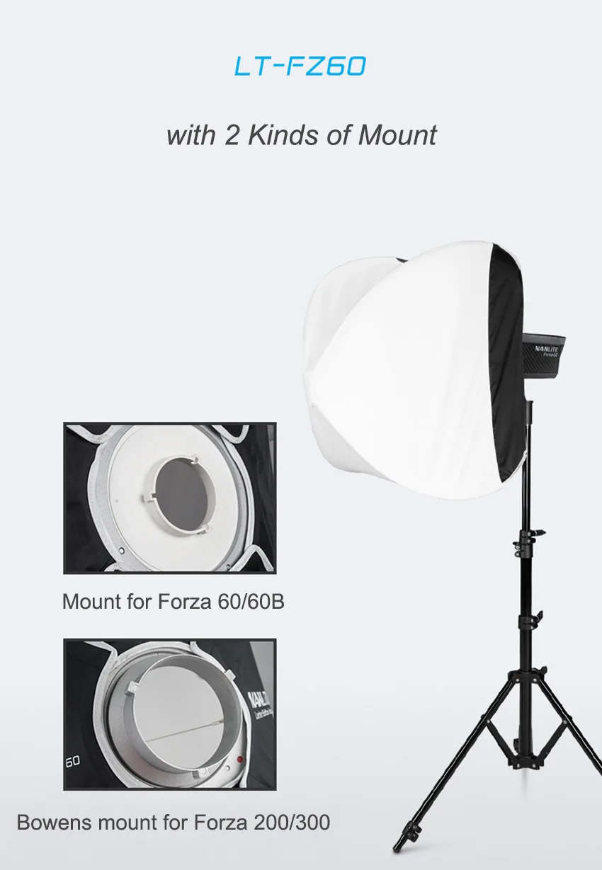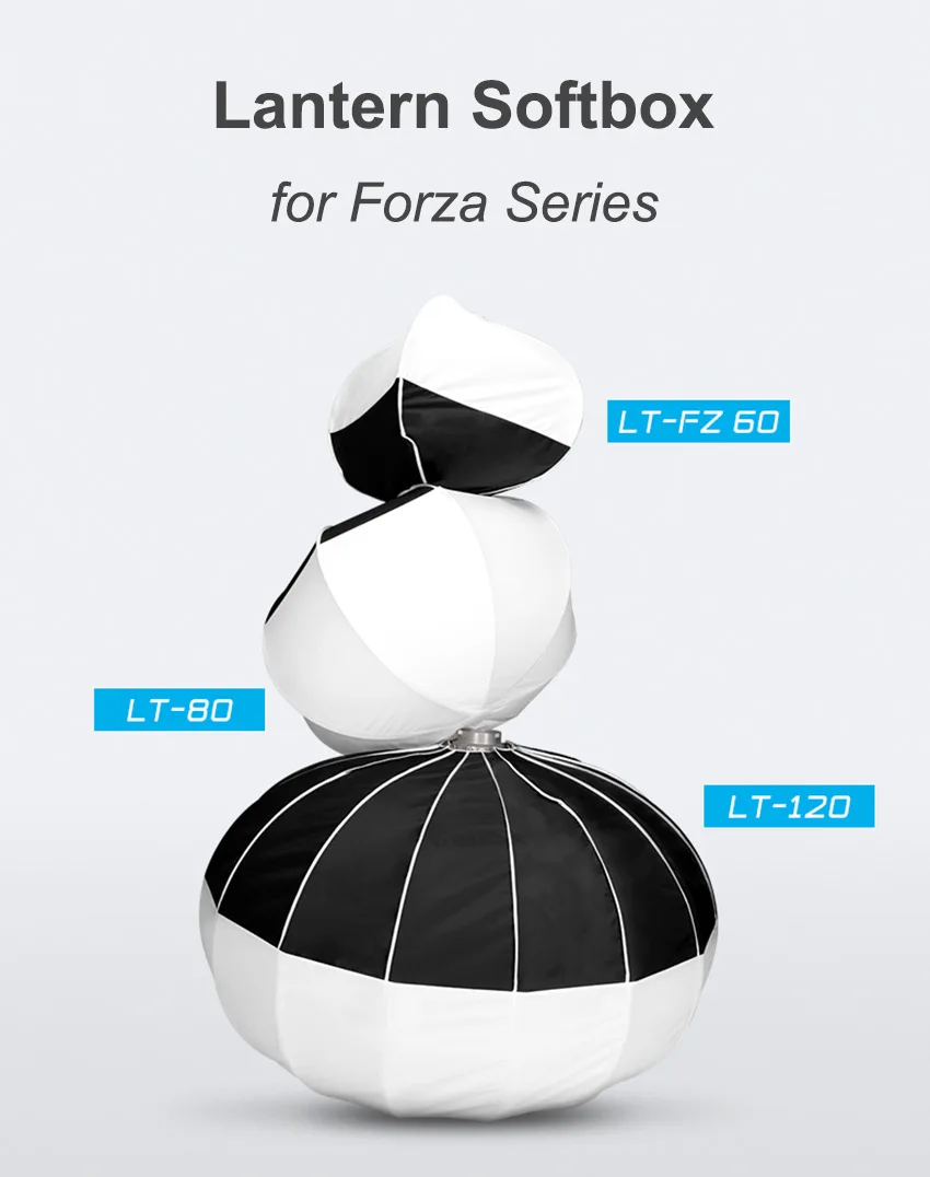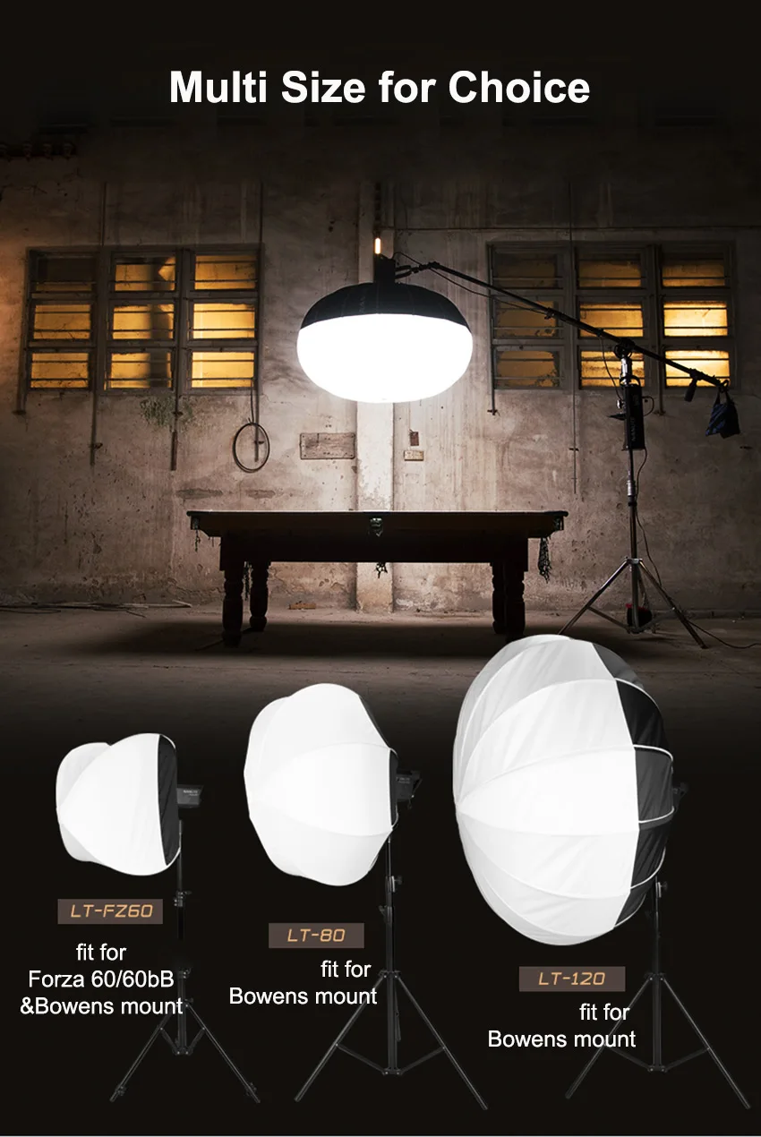 Софтбокс для фонарей LT-FZ60 не только для установки на Forza 60, мы разработали Адаптер для крепления Bowens, что делает LT-FZ60 не ограниченным ДЛЯ Forza 60, А также совместим с другими стандартными лампами Bowens, с глобусом для всенаправленного освещения для небольших, средних и больших площадей.