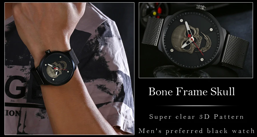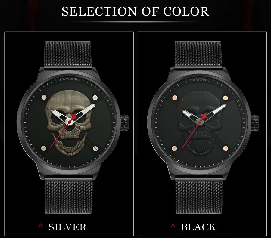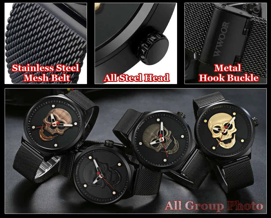 Характеристика: -Светящийся -Крутой циферблат с черепом -Чехол из цинкового сплава -Кварцевый механизм высокого качества -Японская батарея -Водонепроницаемый (поддержка бассейна и холодного душа, не подходит для любой горячей воды) Характеристики (приблизительное значение): -Чехол диаметр: 48 мм -Чехол Толщина: 13 мм -Полоса пропускания: 22 мм Общая длина: 22 мм Посылка включает в себя: -Часы WWOOR-1 шт. -1 x WWOOR тег -1 инструмент для регулировки ремня