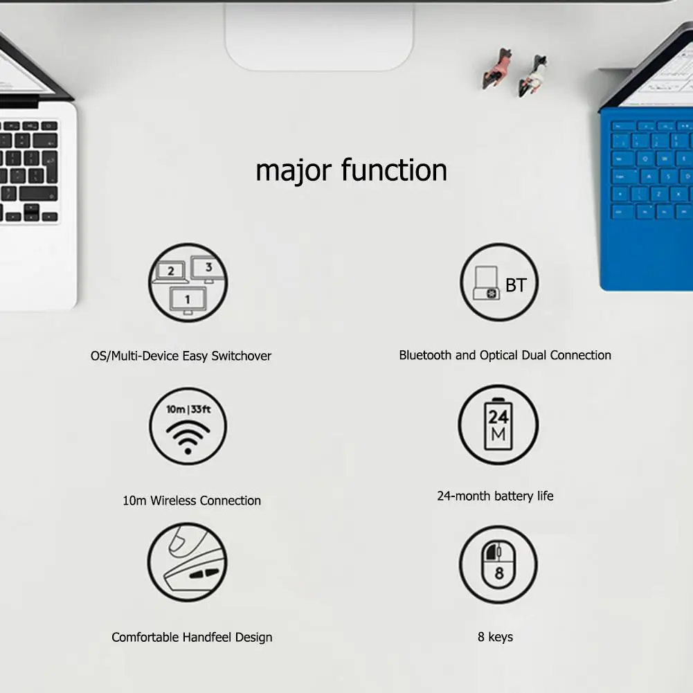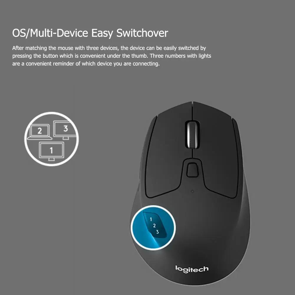 Сопряжение мыши с 3 компьютерами, нажмите на удобную кнопку под большим пальцем, чтобы легко переключиться между компьютерами. 3 номера освещения позволяют вам в любое время узнать, какое устройство подключено.