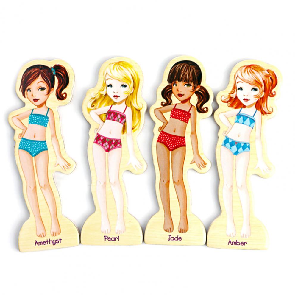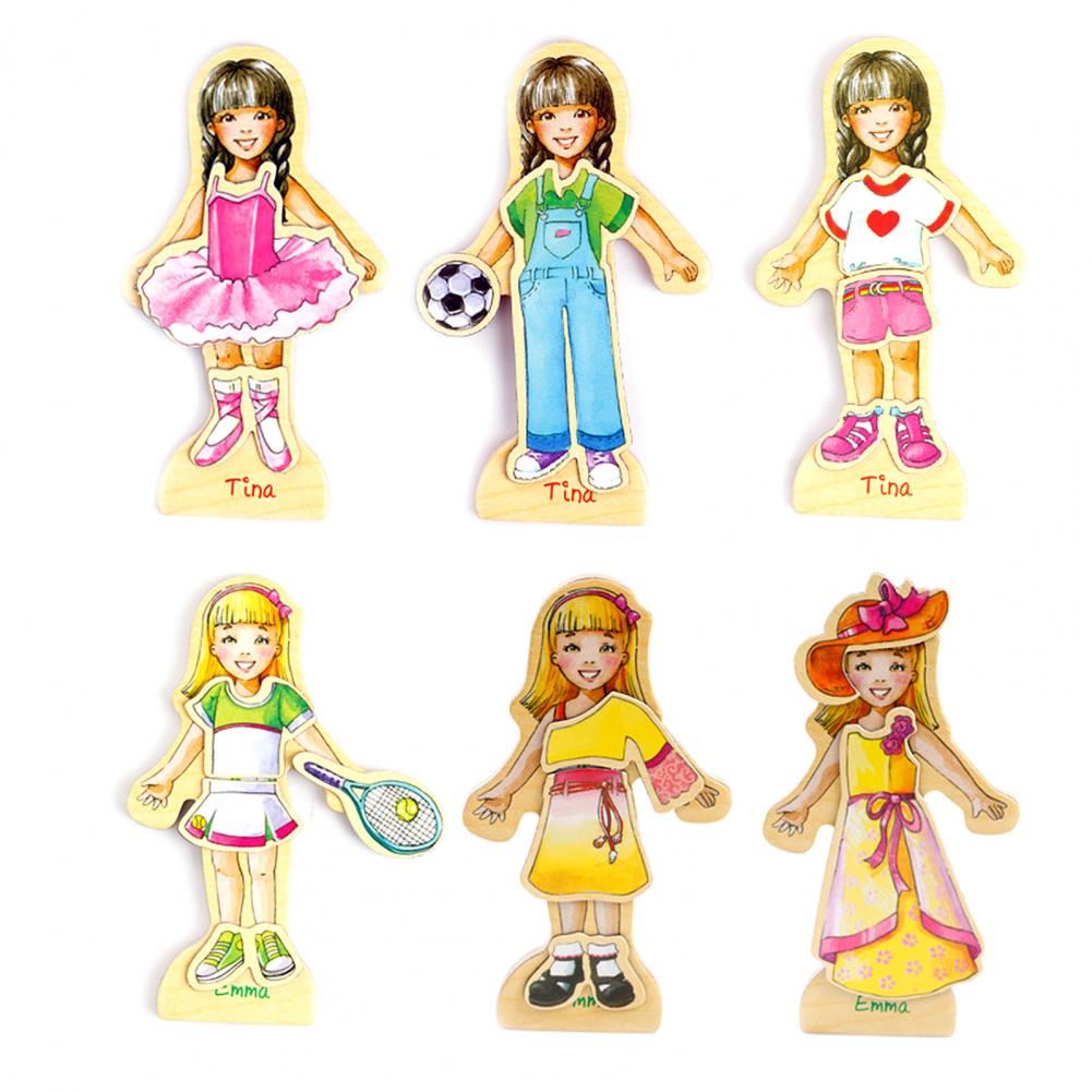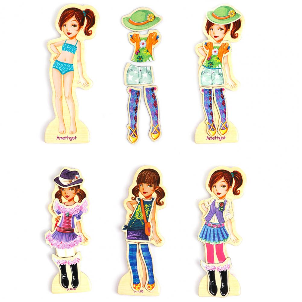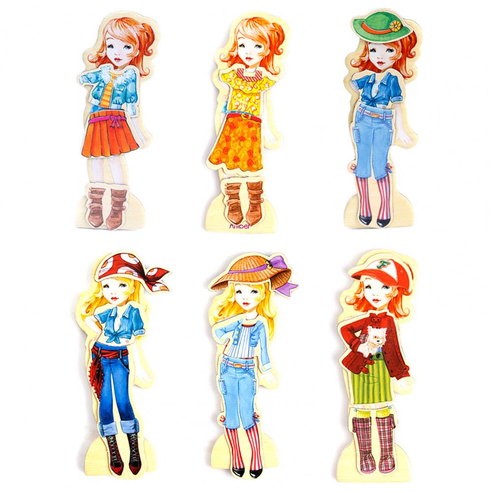 В комплекте 63 наклейки и 4 деревянные куклы, которые можно сочетать более чем с 100 формами.