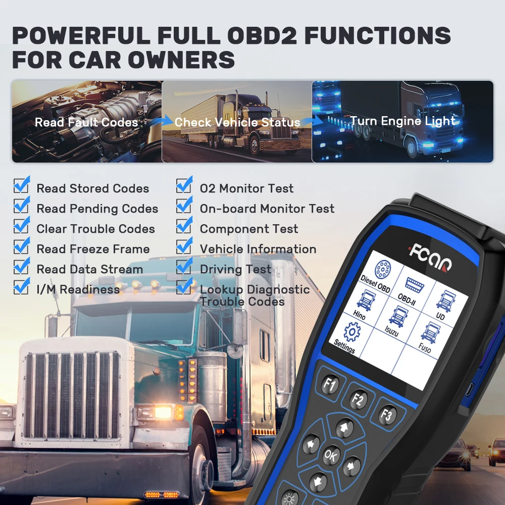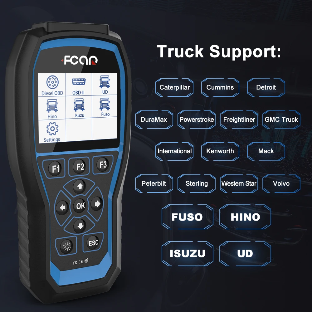 ① 【Широкое применение 】грузовики HD: для Freightliner, для Fuso, для GMC, для Hino, International, для Isuzu, для Iveco, для Kenworth, для Mack, для Mercedes, Для Nissian UD,Peterbilt, стерлинг, для Western Star, для Volvo, для Allion, для Bendix, для Eaton, для Wabco, Для ZF и т. Д. И все автомобили/мин фургоны светильник грузоподъемности с 1996 г. Считыватель кодов F506 Pro также может использоваться в качестве универсального считывателя кодов OBD II для считывания и стирания кодов на OBD-системе других брендов.