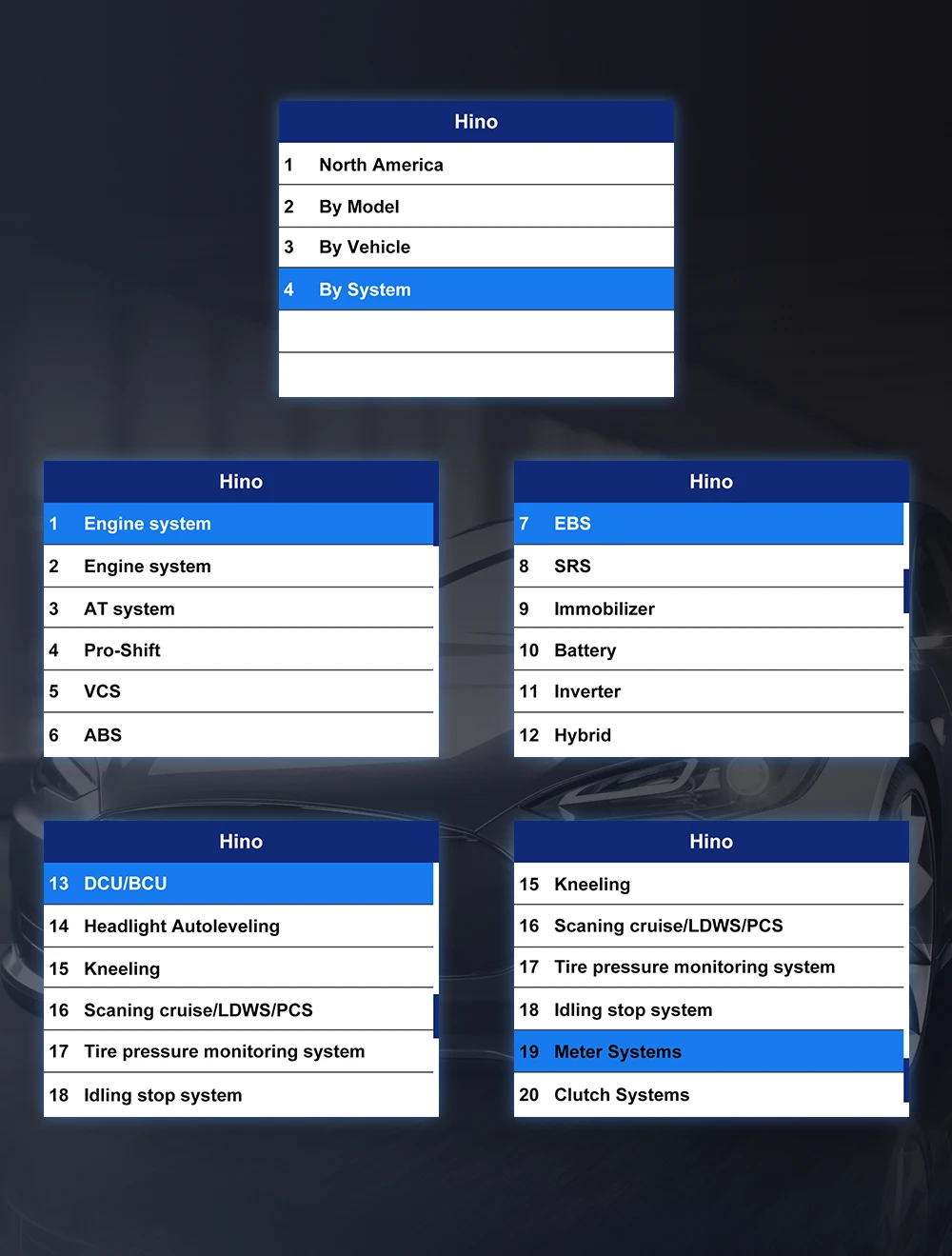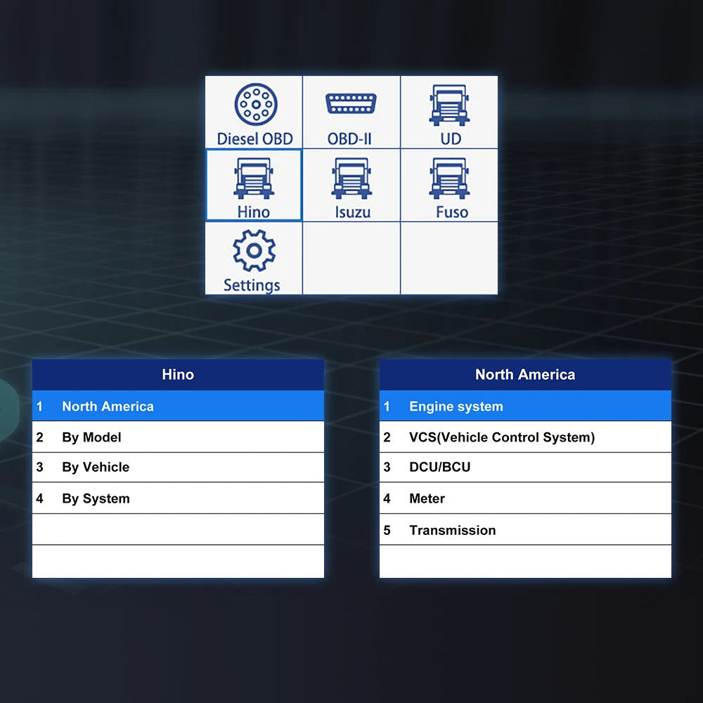 Работает на большинстве грузовиков с автомобильным покрытием J1708 и J1939 plus OBD2 и покрывает коммерческие автомобили Hino, Mishubishi Fuso, Isuzu и Nissan UD. С 1992 года