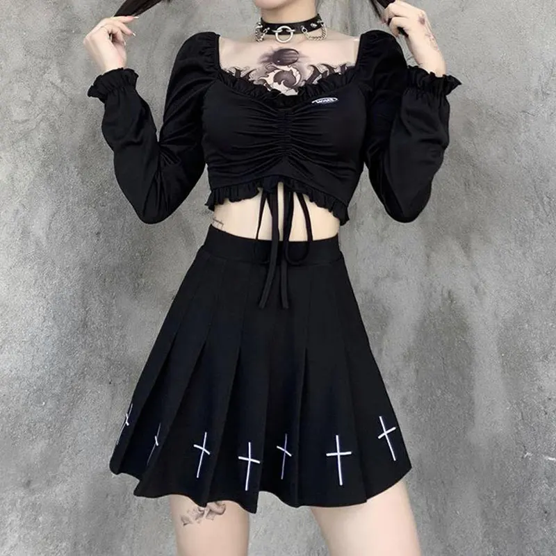 Эмо Панк Черная юбка женская готическая юбка Лолита Харадзюку Высокая талия уличная юбка Y2k Подростковая Эстетическая гранж одежда