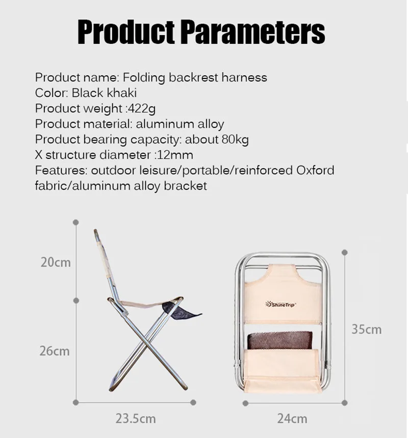 Название продукта: Складная Спинка жгут Цвет: черный, хаки Вес изделия: 422 г Материал изделия: алюминиевый сплав Несущая способность продукта: около 80 кг X Диаметр конструкции: 12 мм Особенности: отдых на открытом воздухе/портативный/усиленная ткань Оксфорд/кронштейн из алюминиевого сплава