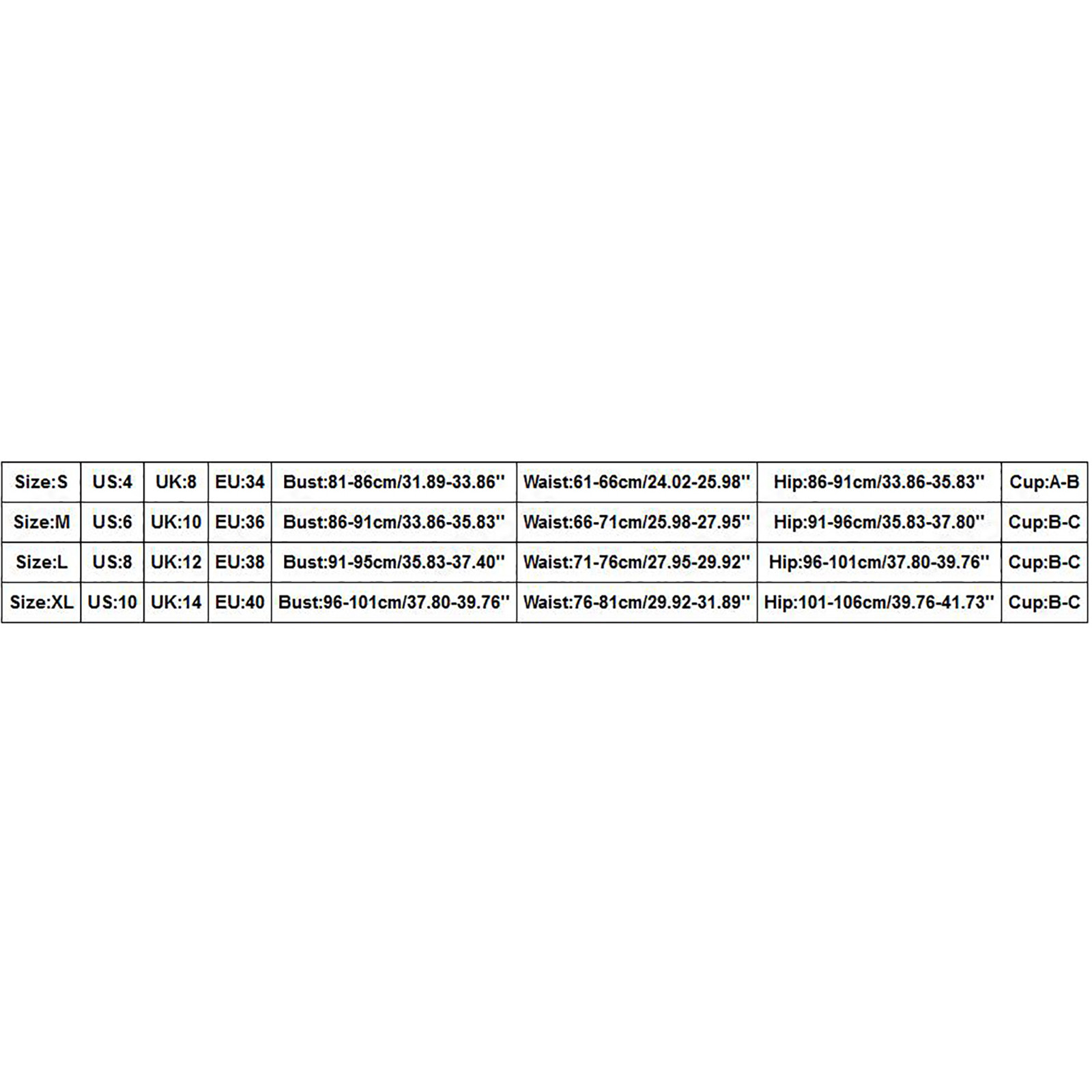 Размер США Великобритания ЕС Бюст Талия Бедра Чашка S 4 8 34 81-86 см/31,89-33,86'' 61-66 см/24,02-25,98'' 86-91 см/33,86-35,83'' A-B М 6 10 36 86-91 см/33,86-35,83'' 66-71 см/25,98-27,95 дюйма 91-96 см/35,83-37,80'' B-C L 8 12 38 91-95 см/35,83-37,40'' 71-76 см/27,95-29,92'' 96-101 см/37,80-39,76'' B-C XL 10 14 40 96-101 см/37,80-39,76'' 76-81 см/29,92-31,89'' 101-106 см/39,76-41,73'' B-C