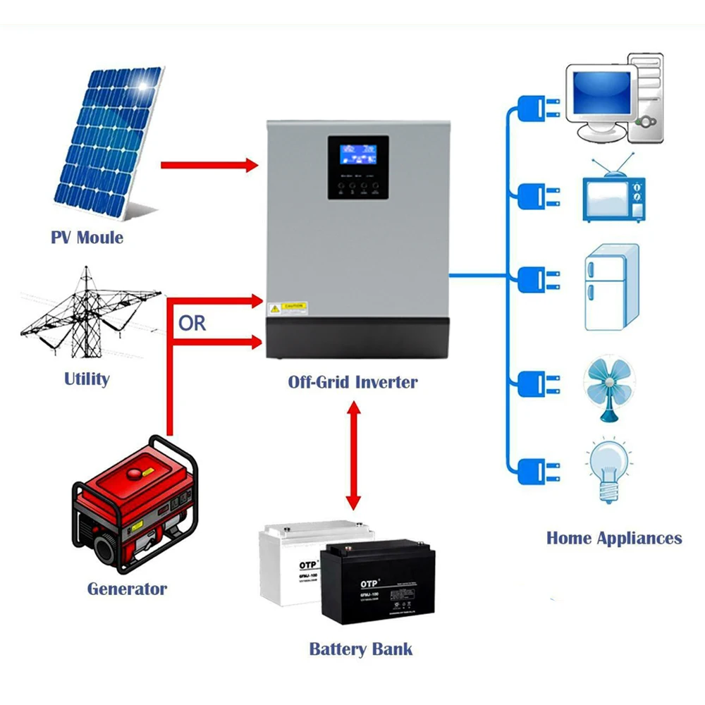 Встроенный ШИМ контроллер солнечного зарядаНастраиваемый Диапазон входного напряжения для домашнего применения и персональных компьютеров с помощью ЖК-дисплеяНастраиваемый AC/солнечное зарядное устройство приоритет через ЖК-настройкиНастраиваемый AC/Solar вход приоритет через ЖК-настройкиСовместим с напряжением сети или мощностью генератораАвтоматический перезапуск во время восстановления переменного токаЗащита от перегрузки/перегрева/короткого замыканияУмная Система зарядки оптимизирует работу аккумулятораФункция холодного запускаСолнечный инверторПроконсультируйтесь с вашим системным интергратором для других возможных системных архитектур в зависимости от ваших требований. Этот Инвертер может питать все виды аппликаторов в домашней или офисной среде, включая Аппликаторы моторного типа sucha как трубный светильник, вентилятор, холодильник и кондиционер