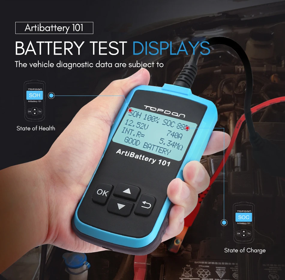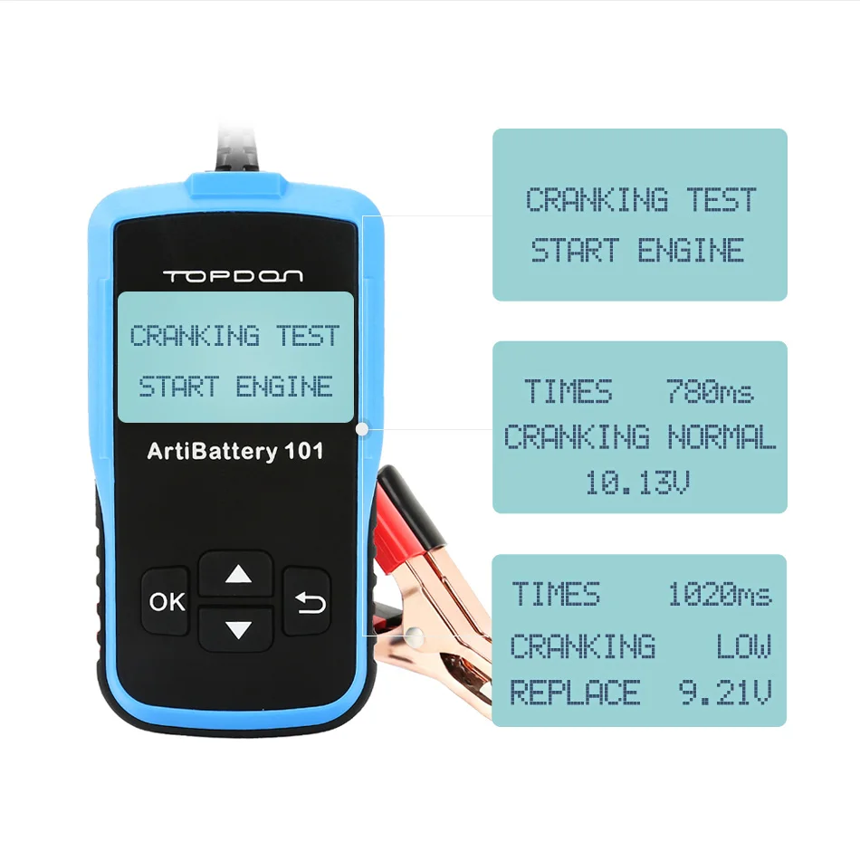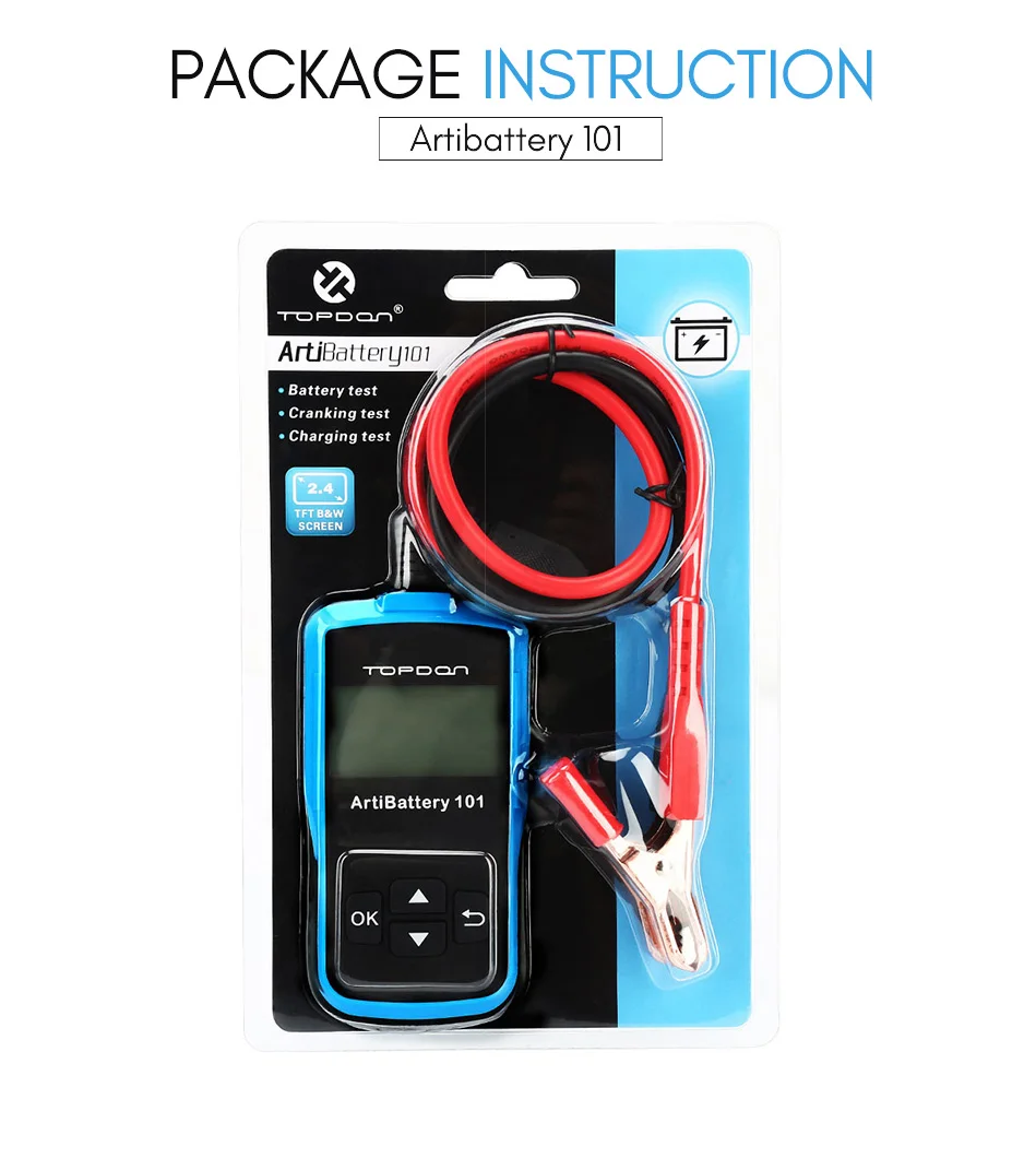Arti Battery 101, применяя передовую технологию тестирования проводимости, помогает механикам легко, быстро и точно найти проблему; Тестирование сгибания, зарядки, И Обычная неисправность для всех автомобильных свинцово-кислотных аккумуляторов, включая обычные свинцово-кислотные батареи, гелевые батареи, AGM плоская пластина и спиральная батарея. Для анализа здорового состояния батареи, чтобы рассчитать фактическое холодное сгибание, способность батареи и степень старения, которые обеспечивают надежные доказательства анализа для тестирования и обслуживания батареи.