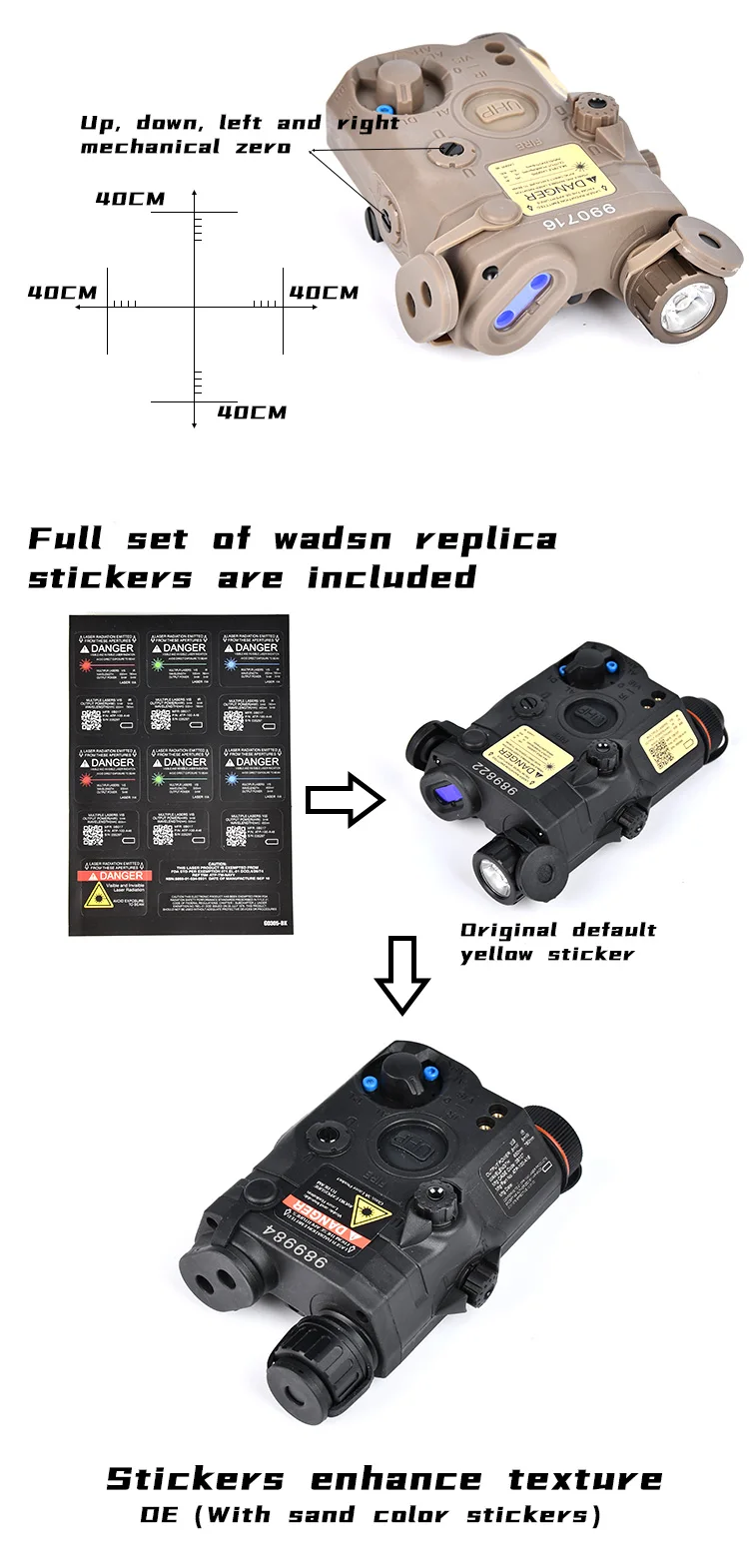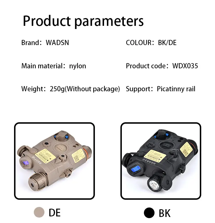 Бренд: WADSN Высокоточный красный точечный Лазер интегрированный с светодиодный Flashlig Номер товара: WDX035-WDX036-WDX037 Цвет: черный, песочный Цвет лазера: красный, зеленый Материал: нейлон Тактический переключатель: WDX035 светодиодный светильник/IR fill/красный лазер/светодиодный фонарик, WDX036 светодиодный светильник/IR лазер/красный лазер/светодиодный фонарик, WDX037 светодиодный светильник/IR лазер/зеленый лазер/светодиодный фонарик Тип лампы: светодиодный Тип рельса: подходит для рельсов диаметром 20 мм Вес: 250 Вес нетто Тип батареи: 1x CR123A 3V или 16340 3,7 V (продукт не включает батареи)