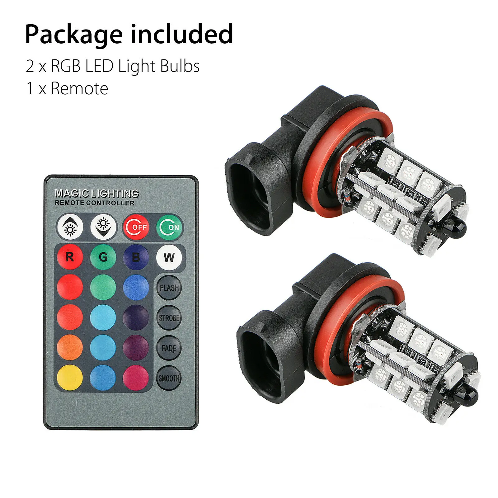 Комплект автомобильных противотуманных светильник р RGB поставляется с 2 светодиодными лампочками и пультом дистанционного управления. Каждая светильник почка поставляется с 27 светодиодами, пульт дистанционного управления поддерживает включение/выключение питания, статическую яркость цвета и скорость регулировки динамического эффекта, изменение статических цветов и изменение 4 режимов, делает ваш автомобиль более очаровательным и ярким, ваш стиль и индивидуальность без ущерба для безопасности на дороге в менее чем идеальном состоянии. И помогает другим водителям легко отличить ваш автомобиль для дополнительной безопасности. Подходит для парковки, резервного копирования, ночного вождения, вождения в туманную погоду, дневных ходовых огней и т. д.