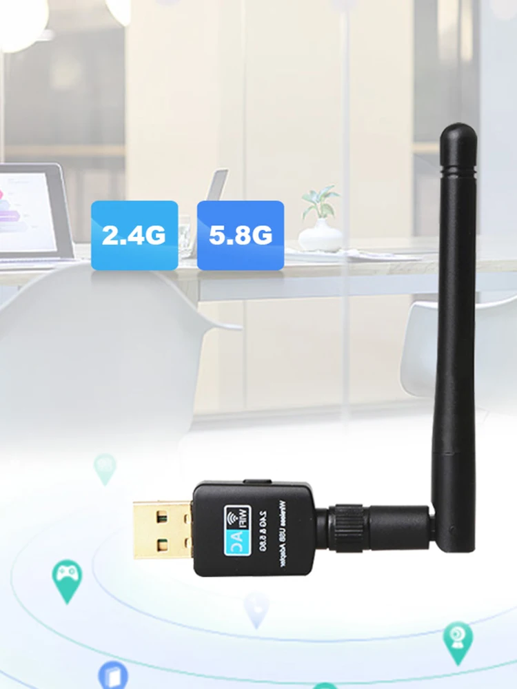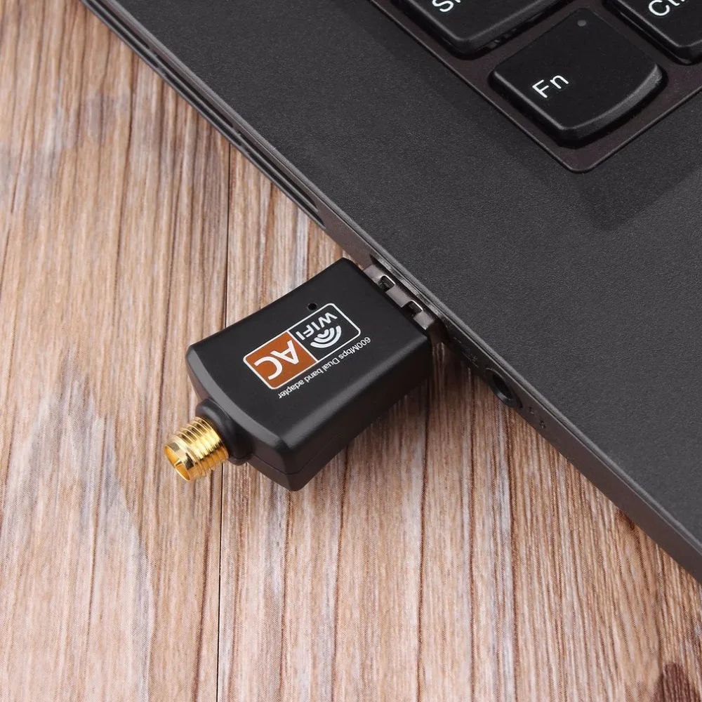 Specification Interface: USB 2.0Wifi Band: 2.4GHz-5.8GHzTransmission Rate: 600Mbps( 2.4G/150M+5G/433M)Network Protocol: CSMA/CA with ACKWork Temperature: 0°C - 45°CStorage Temperature: -40°C - 70°CWork Humidity: 10% - 90% no congealStorage Humidity: 5% - 90% no congealLED Indicator: StatusAntenna: 2dBi