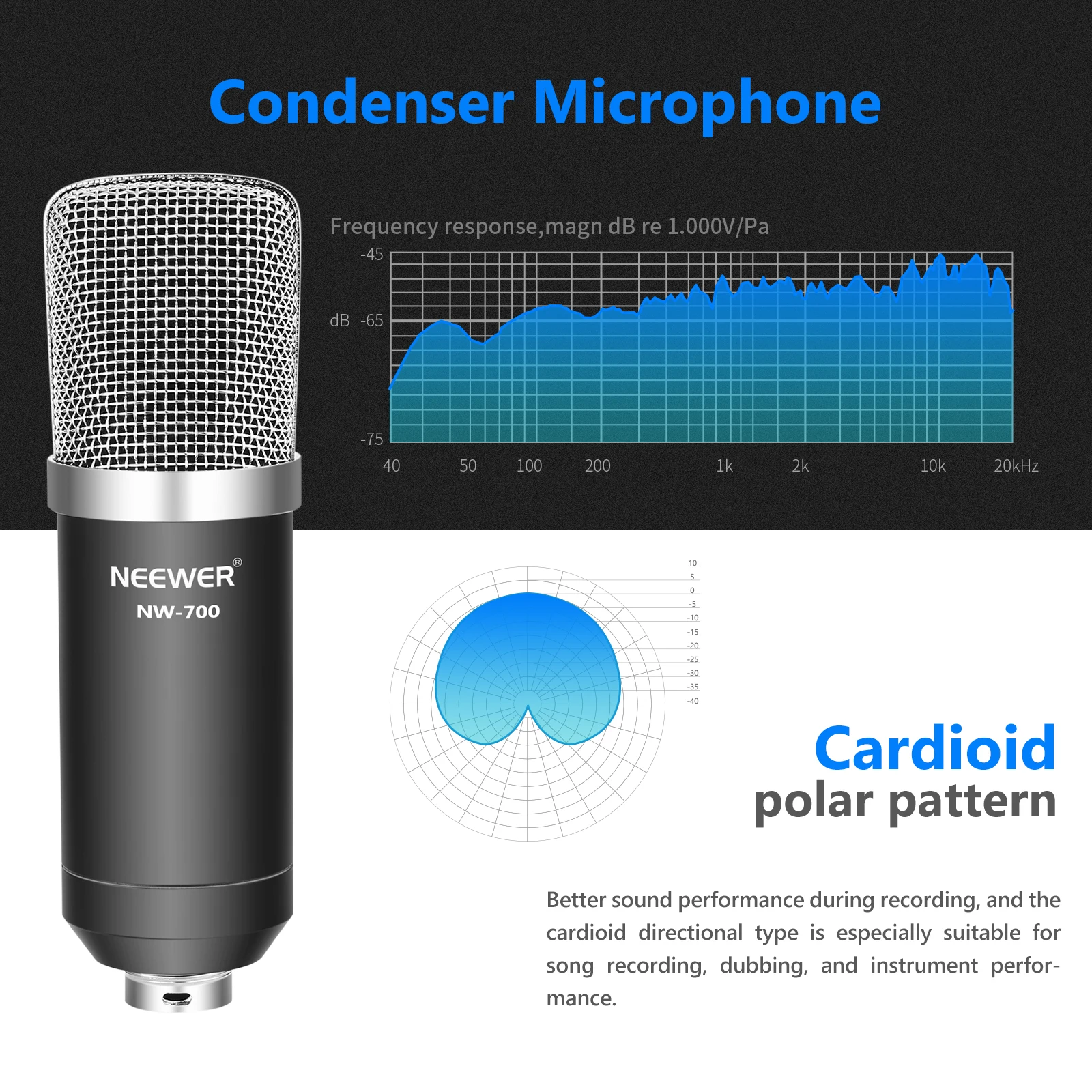 NW-700 профессиональный конденсаторный микрофон принимает совершенно новую аудиоцепь. Захватывайте богатый, полный звук из источников, которые находятся непосредственно перед микрофоном. Кардиоидный пикап-узор минимизирует фоновый шум и изолирует основной источник звука