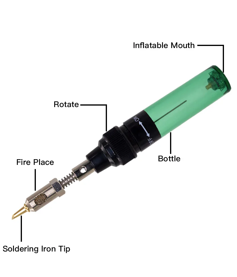 Советы: 1. Этот продукт поставляется со стандартной подковой и не содержит газ на заводе. Перед использованием необходимо приобрести газовый насос. Этому газовому паяльнику нужна Зажигалка для розжига и поддержки горения. 2. При использовании необходимо сначала разжечь (повернуть пламя и сжечь около одной минуты) и сжечь его до определенной температуры, пока сердцевина внутри не станет яркой перед нормальным использованием. Пожалуйста, обратите внимание, что перед включением сердечника пламя погаснет, это не проблема качества! Заправочный газ: 1. Используйте высокочистый газ для заполнения и убедитесь, что выключатель выключен, затем надуйте! 2. Наполните газ, введите газ в воздушное отверстие, нажмите, чтобы надуть. (Примечание: если в хвосте после наливания газа появляется шипящий звук, используйте наконечник ручки или «Лайк», чтобы слегка надавить на воздухозаборник, чтобы устранить его) 3. Около 10 секунд, Заполнение газом может быть завершено. Подождите несколько минут, чтобы газ стабилизировался перед его использованием. Зажигание: 1. Нажмите переключатель в положение ON и услышите "шипящий" звук 2. Используйте воспламенитель или зажигалку для воспламенения возле сустава. При зажигании будьте осторожны, чтобы не слишком сильно открывать выключатель. Уместно открыть середину, чтобы газ держал нагретую головку паяльника 3. После воспламенения Отрегулируйте огневую мощь, направление к ВКЛ увеличивается, а направление к Выкл уменьшается. 4. Температура пламени этого продукта составляет 1300 ℃, а паяльник-450 ℃. После использования выключите выключатель (Примечание: Не распылять на голову вручную) 5. При использовании газового паяльника просим обратить особое внимание на ожидание полного погашения пламени и покраснения предмета внутри паяльника перед продолжением. При регулировке размера пламени не будьте слишком большими, чтобы продлить срок службы жала паяльника.