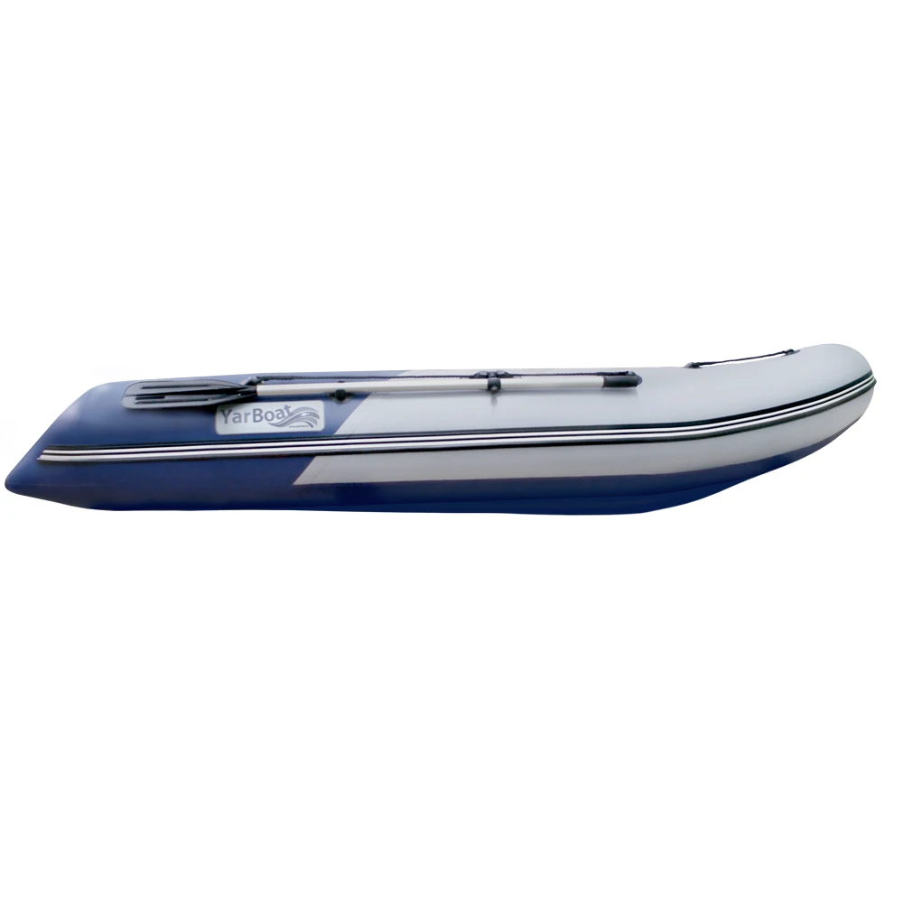 YarBoat 330C - классическая моторная лодка с надувным килем, под мотор максимальной мощностью 15 л.с. У данной модели большой диаметр борта и увеличенная ширина, благодаря чему образуется вместительное и комфортное внутреннее пространство. Оснащена дополнительными деталями для удобства: ручки для переноски в носу и на конусах, рым-кольцо, ручка моториста, леерный шнур по бортам и в носовой части, системой передвижных сидений «ликпаз-ликтрос». От забрызгивания защищают «косынки» в транцевой части, а также привальный брус с брызгоотбойником, который защищает борта при швартовке, также на нем можно закрепить тент или стояночный чехол. В комплект входит пайол из водостойкой фанеры толщиной 9 мм с противоскользящим покрытием. Секции пайола соединяются друг с другом профилем «мама-папа» и фиксируются стрингером.