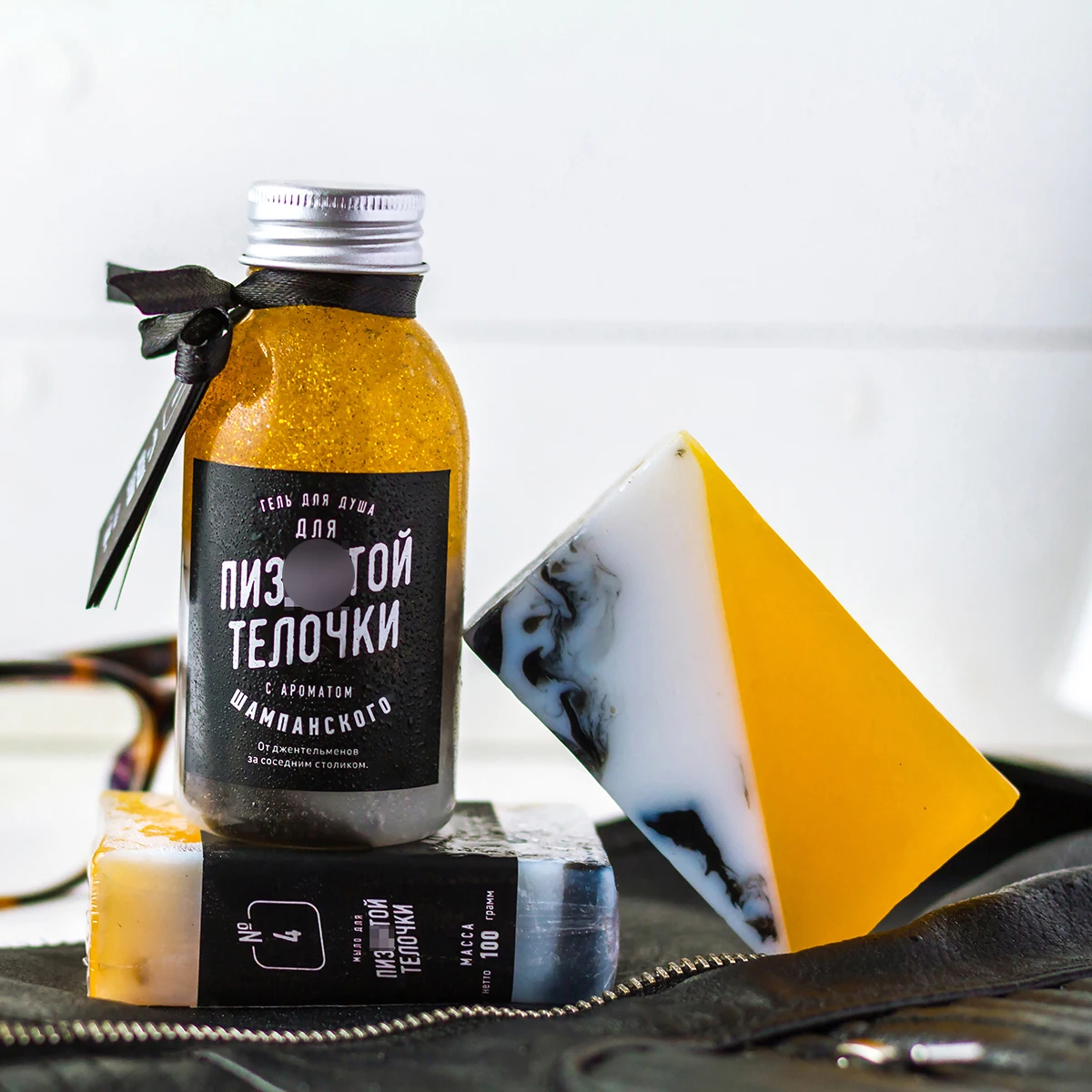 Дизайнерское мыло ручной работы для женщин. Одна половина выглядит как белый мрамор с черными прожилками, вторая как золотое шампанское. Аромат: «Chance» от Chanel. (!) Этикетка содержит ненормативную лексику.
