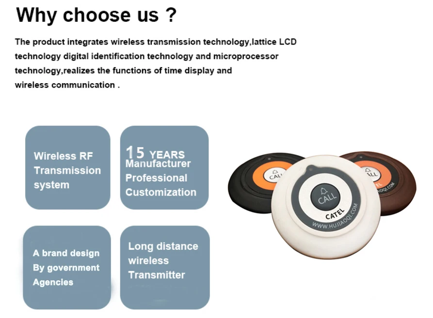 Мы являемся ведущим производителем беспроводных систем paging в Китае и работаем в этой области уже 15 лет. Удовлетворение потребностей каждого клиента-наша миссия. Покупайте у нас, наслаждайтесь лучшим послепродажным обслуживанием!