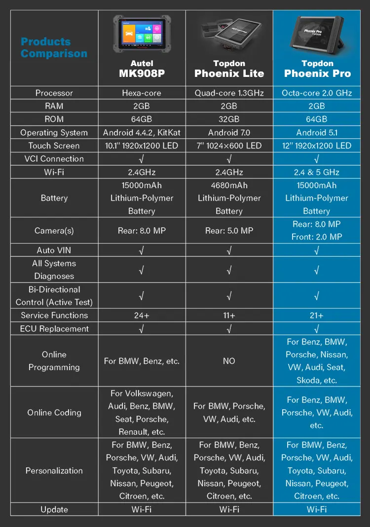 TOPDON Phoenix Pro служит новейшим дополнением к универсальным диагностическим инструментам. Этот усовершенствованный сканер pro-level отличается от других с полным спектром передовых функций, таких как онлайн-программирование и кодирование ECU, активные тесты, 21 наиболее часто используемая сервисная функция, С широкой совместимостью транспортных средств. Его качество и техническая поддержка соответствуют первоклассным стандартам, что очень выгодно для опытных диеров, автомехаников и владельцев гаражей.