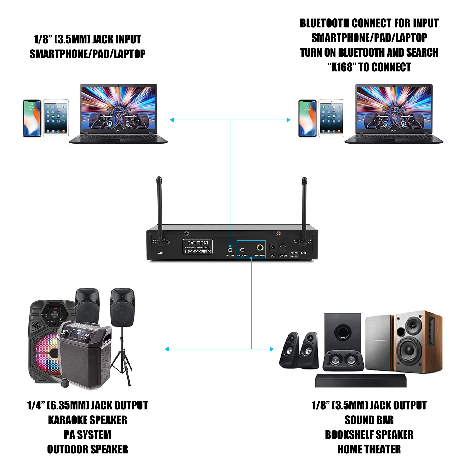 3. 【Встроенный эхо-эффект и bluetooth】беспроводной Микрофон имеет регулируемую ручку управления эхо. Допускается смешивание микрофона с музыкальным сигналом без использования миксера. Функция Bluetooth для воспроизведения фоновой музыки (Включите Bluetooth и выполните поиск «X168» для подключения, диапазон BT около 32 футов)