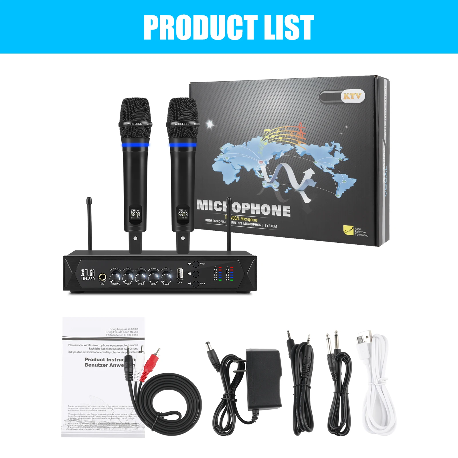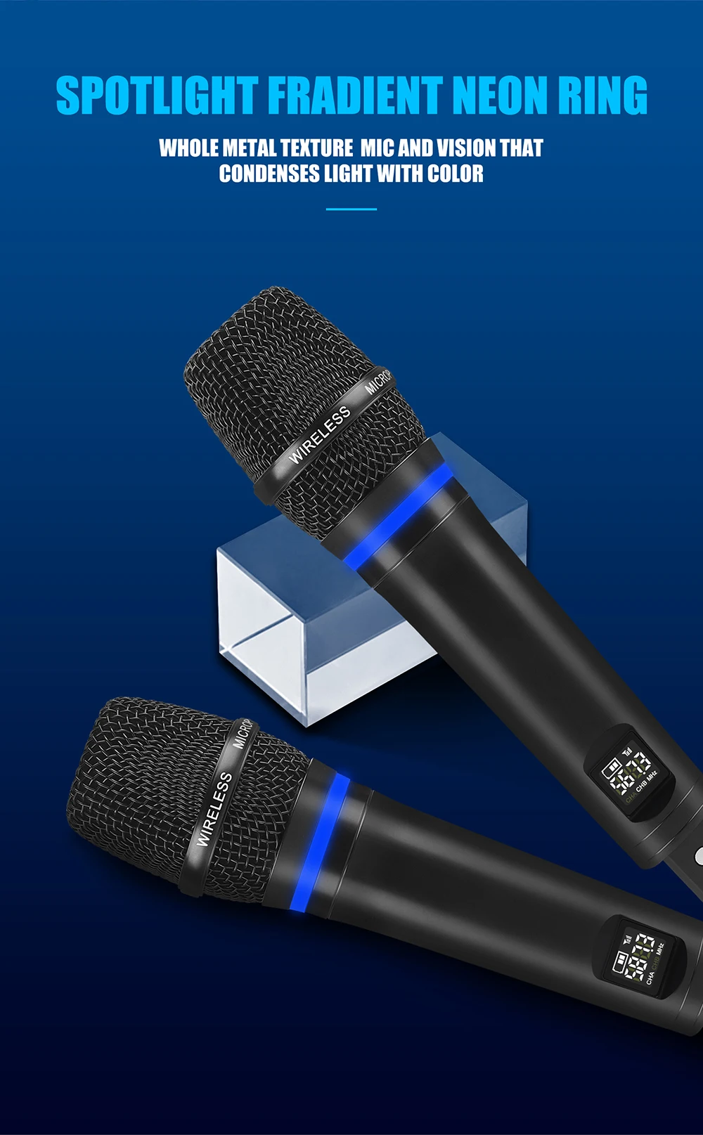 1. Metal полностью Металлическая UHF Беспроводная микрофонная система 】двухканальная перезаряжаемая и Регулируемая частота-расстояние беспроводного подключения микрофона составляет около 262 футов (80 м),50 каналов выбираемых частот. Расстояние соединения Bluetooth составляет 10 м. Стабильность сигнала/отсутствие задержки/отсутствие излучения/Защита от вымывания/Защита от помех/супер более четкое качество звука.