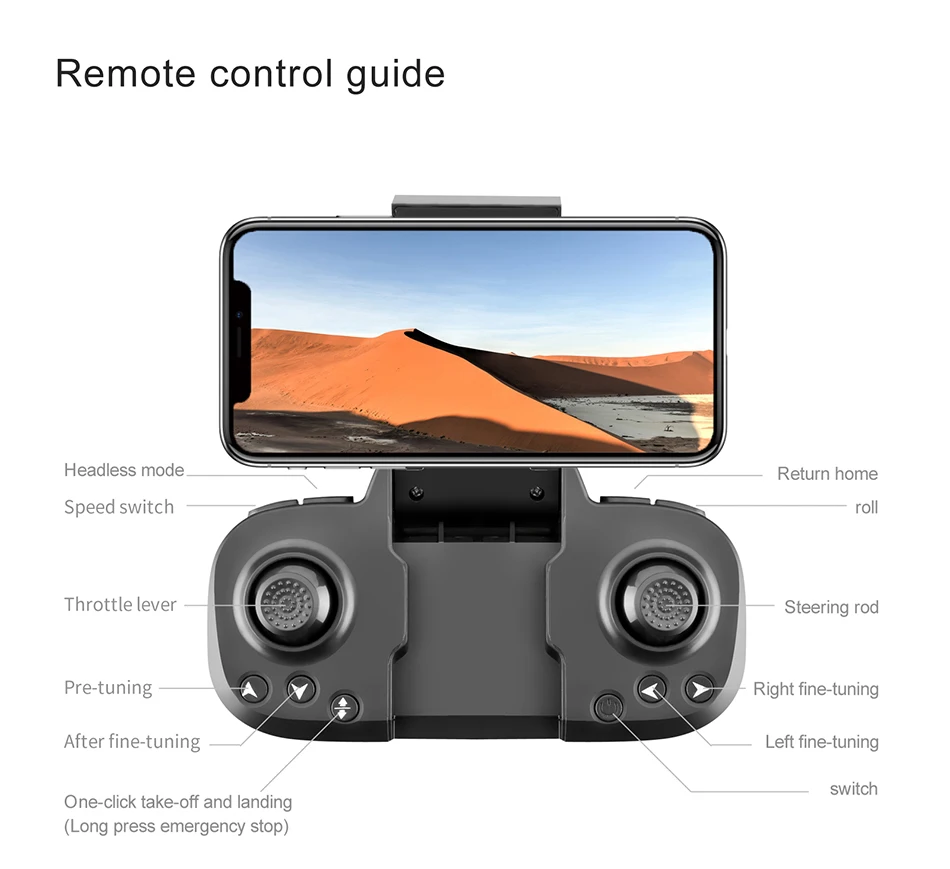 Функции: вверх/вниз, вперед/назад, поворот влево/вправо, боковой полет, светодиодный свет, Безголовый режим, автовозврат одной кнопкой, режим удержания высоты, WiFi FPV