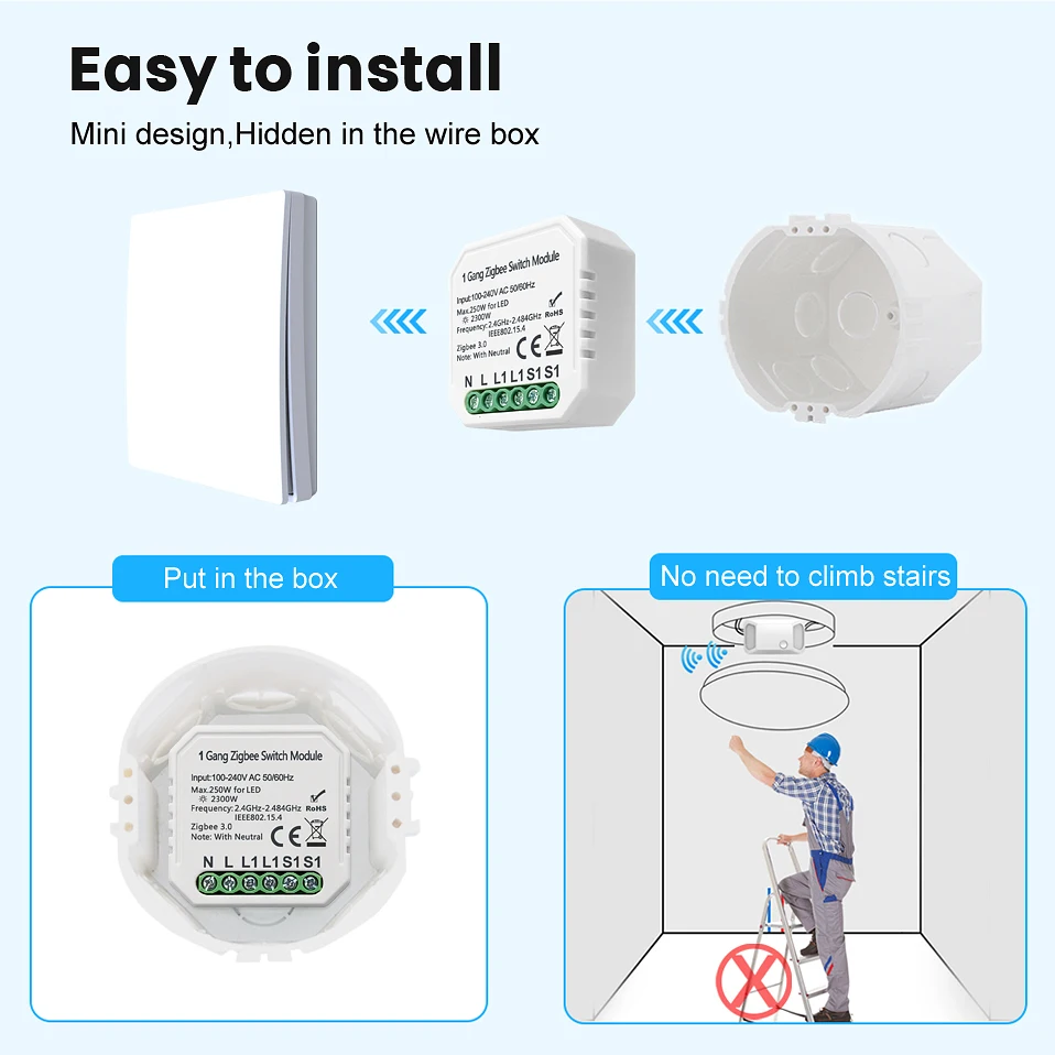 [Мини-размер, легко установить]-корпус ультра мини может легко спрятаться в традиционную коробку-переключатель, умный ваш дом без изменения украшения. Также он прост в установке, отличный товар для самостоятельного изготовления. (Примечание: совместим с клавишным и сенсорным переключателем, но не совместим с переключателем сброса).