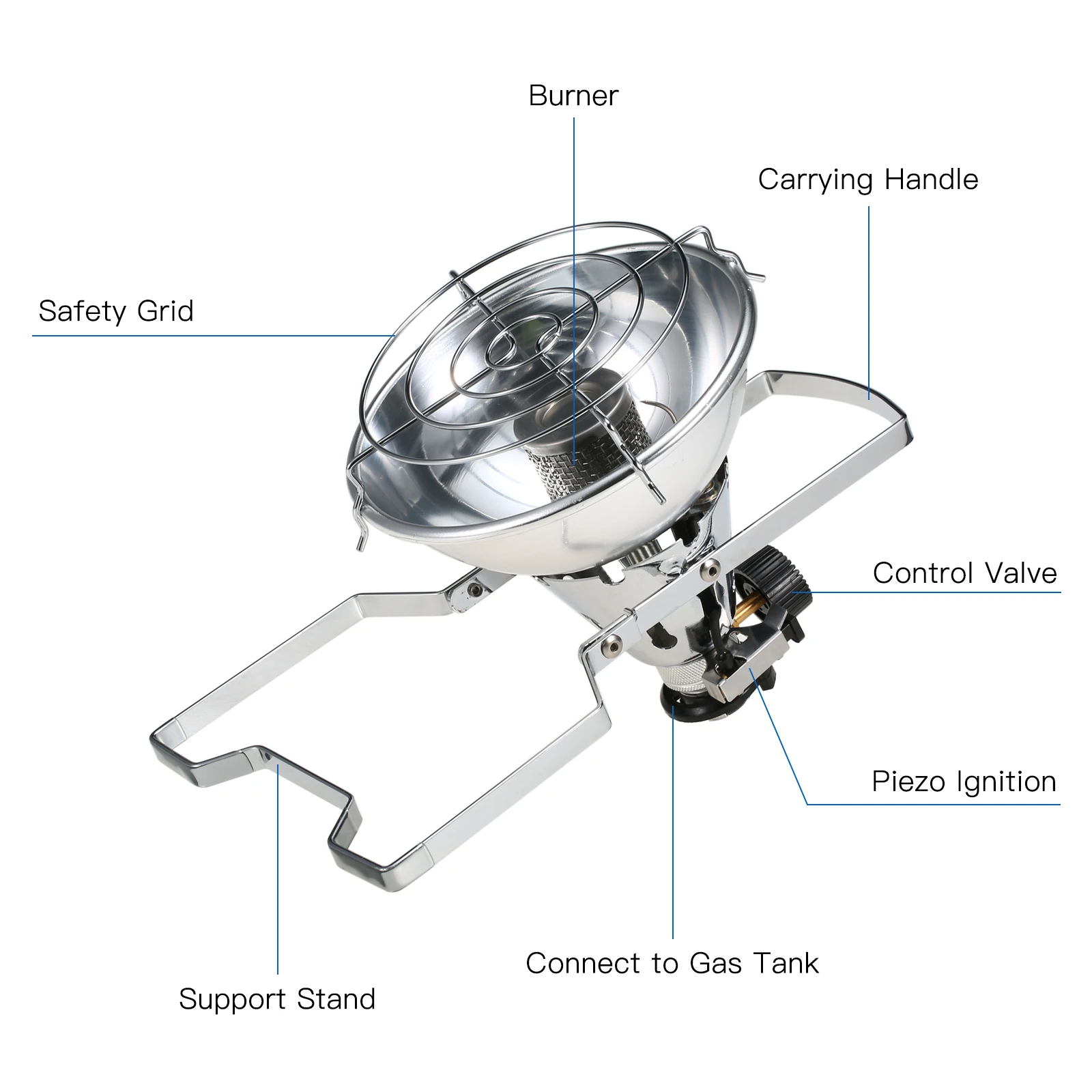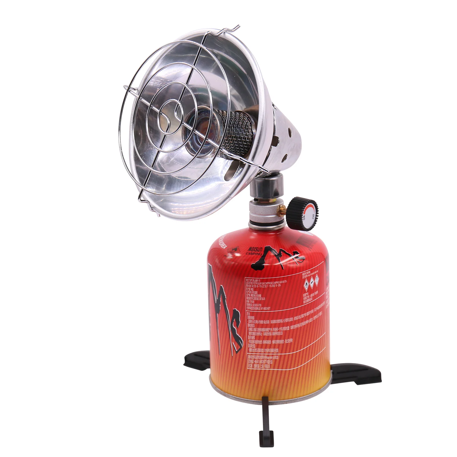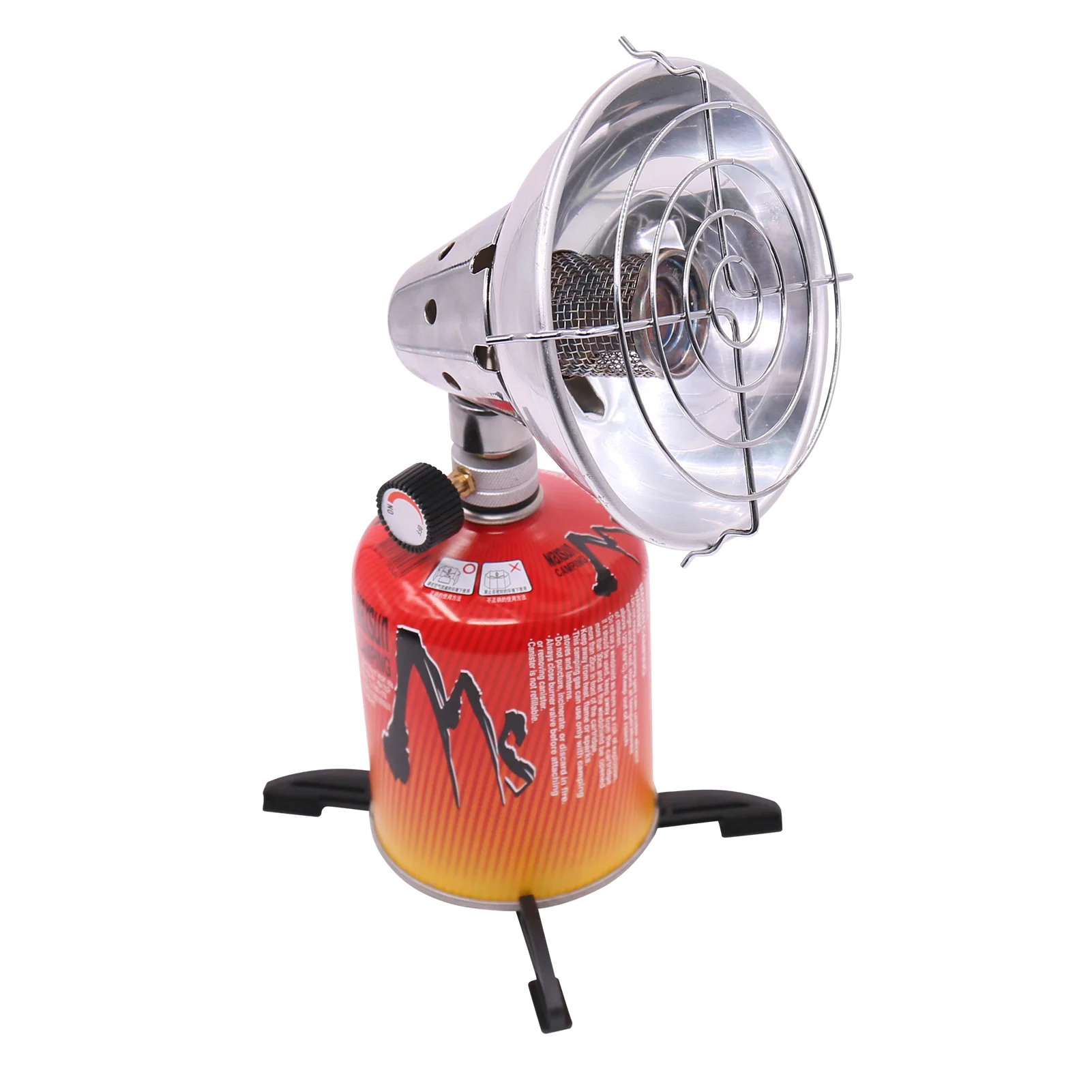 Газовый нагреватель безопасен в использовании, с клапаном управления огнем для регулировки огневой мощи. Два опорных держателя подходят для плоского бака и горизонтального бака. Легко носить с собой для кемпинга на открытом воздухе.