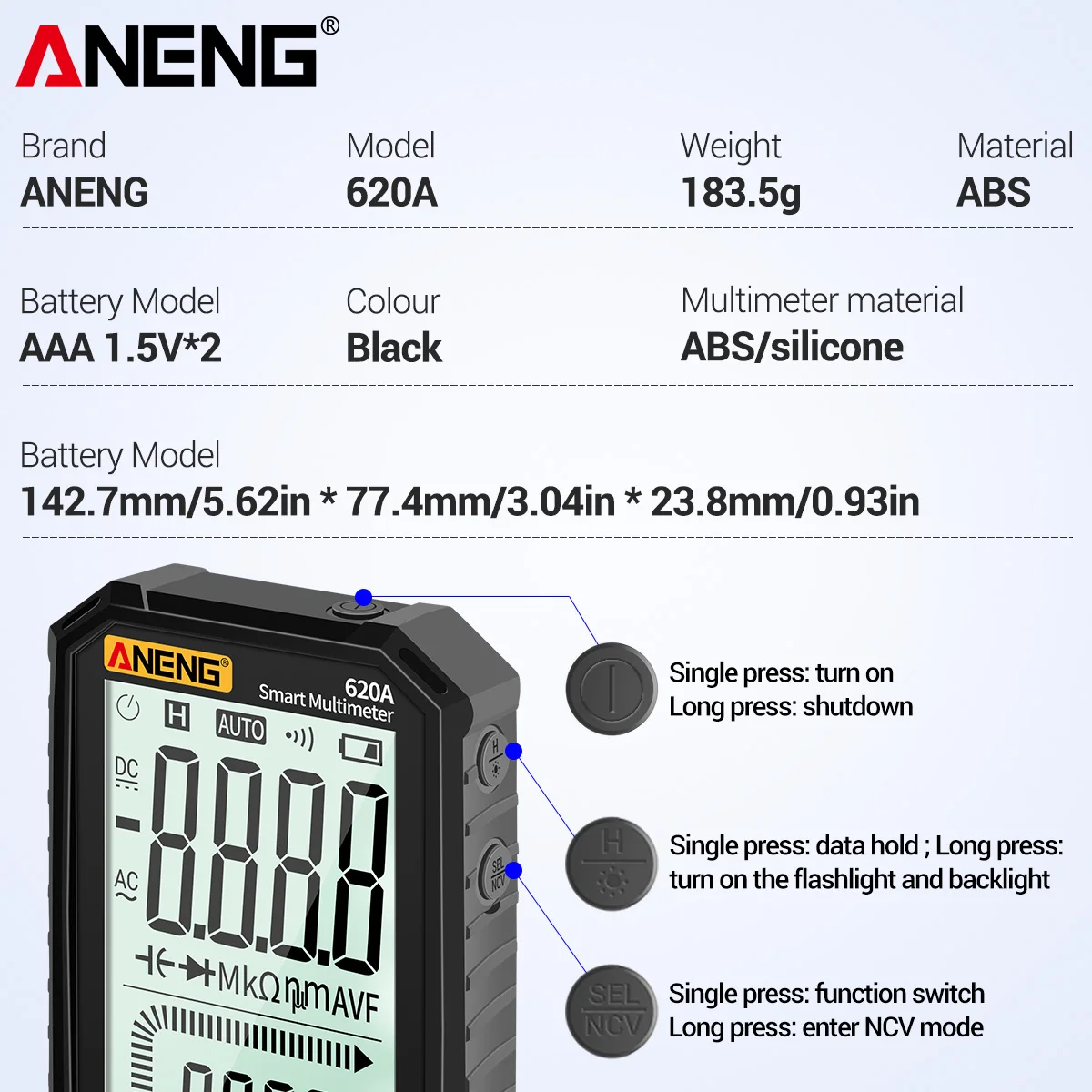 Карманный мультиметр ANENG оснащен размером с ладонь, большим ЖК-дисплеем 4,77 дюйма, автоматическим выбором диапазона, истинным среднеквадратичным значением, защитой от перегрузки, противоударным силиконовым покрытием и звуковым сигналом бесконтактного тока напряжения. Он Ультрапортативный для обслуживания автомобилей, электроники, бытовой техники, ОВКВ и многого другого.