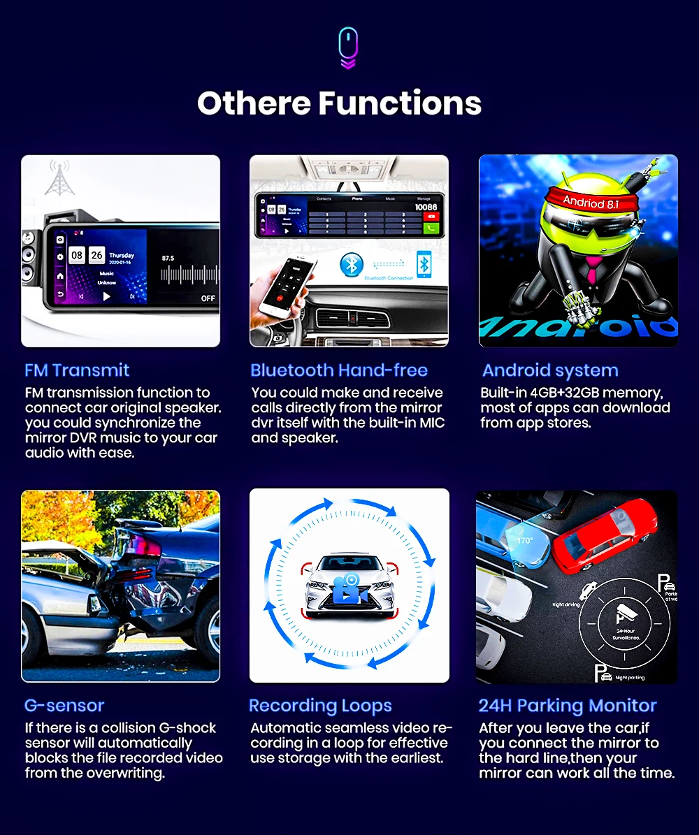 > Android 8,1 + gps-навигация + ADAS + 4G SIM интернет + WiFi + Bluetooth + управление приложением (Хранитель) + 12 дюймов IPS сенсорный Экран + 1080P Запись + Оперативная память 4 ГБ/Встроенная память 32GB + Тройная Экран
