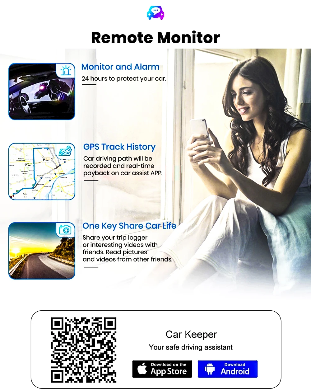 Отслеживайте местоположение вашего автомобиля, удаленно фиксируйте, что происходит с вашим автомобилем из любой точки мира. Просматривайте изображения и смотрите видеоклипы вашего автомобиля с помощью приложения на вашем смартфоне, как только вы Подключитесь к Интернету.