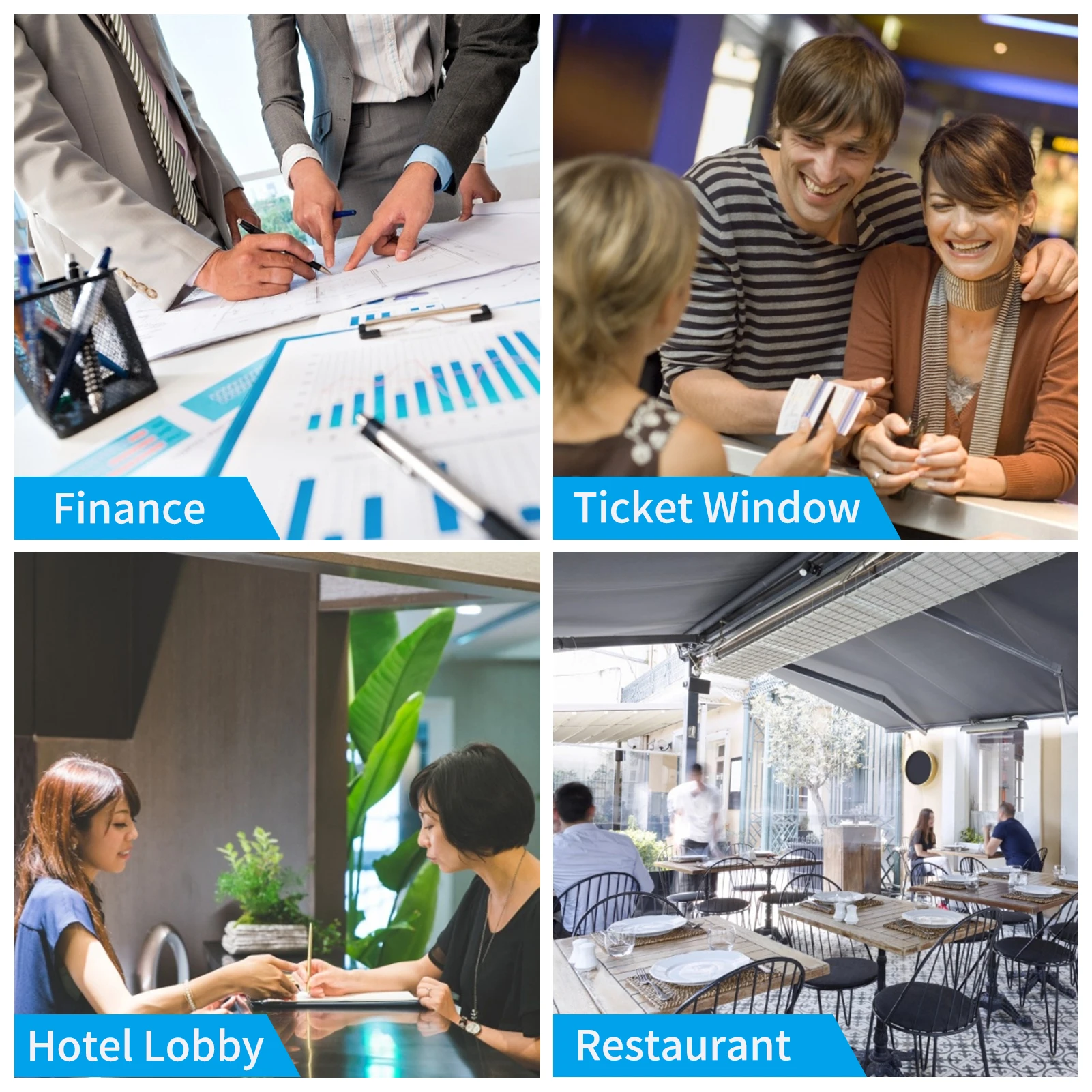 Широко используется в банке, бизнесе, выставках, гостиничном вестибюле, окнах для билетов, ресторанах, кухне, на стойке регистрации и на кассе и т. д.