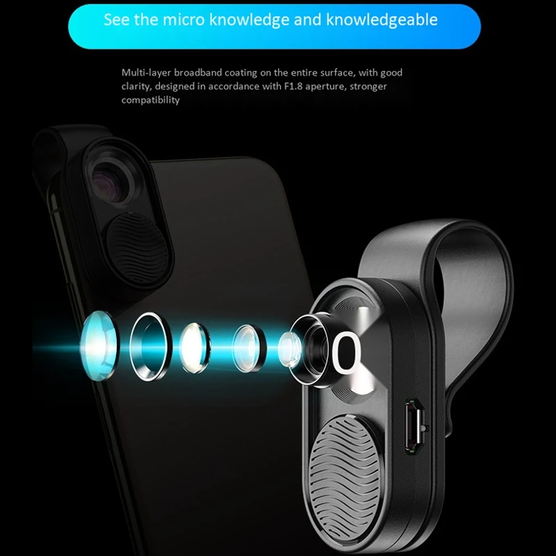 1,100 раз увеличение мобильного микроскопа, 100 раз супер высокое разрешение 3,6 ~ 5 мм объектив с светодиодный подсветкой, эффективное изображение. Этот ультра-легкий аксессуар превращает ваш телефон в профессиональный микроскоп.