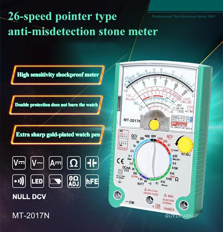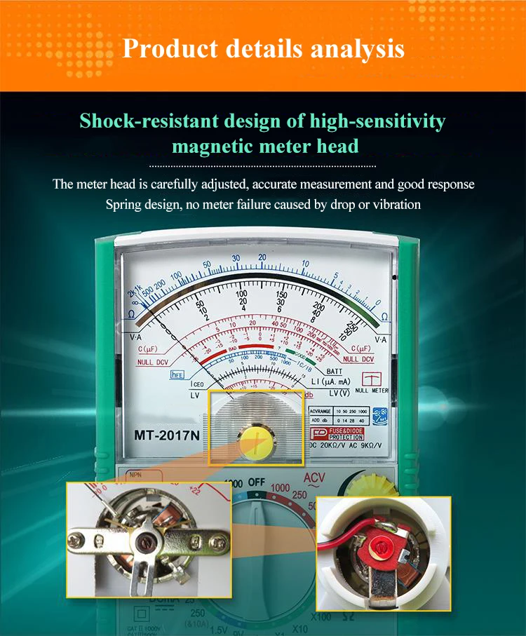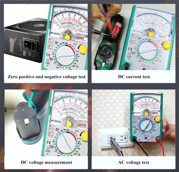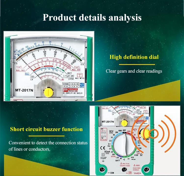 Название продукта: Универсальный измеритель 26 скоростей Модель: MT-2017N Вес: 1,0 кг Тест на Зуммер непрерывности: Да Тип: аналоговый мультиметр Функции измерения: емкость, аккумулятор, сопротивление, постоянный ток, напряжение переменного тока, Стиль: ручной мультиметр