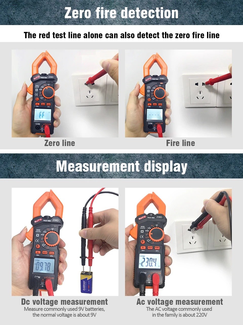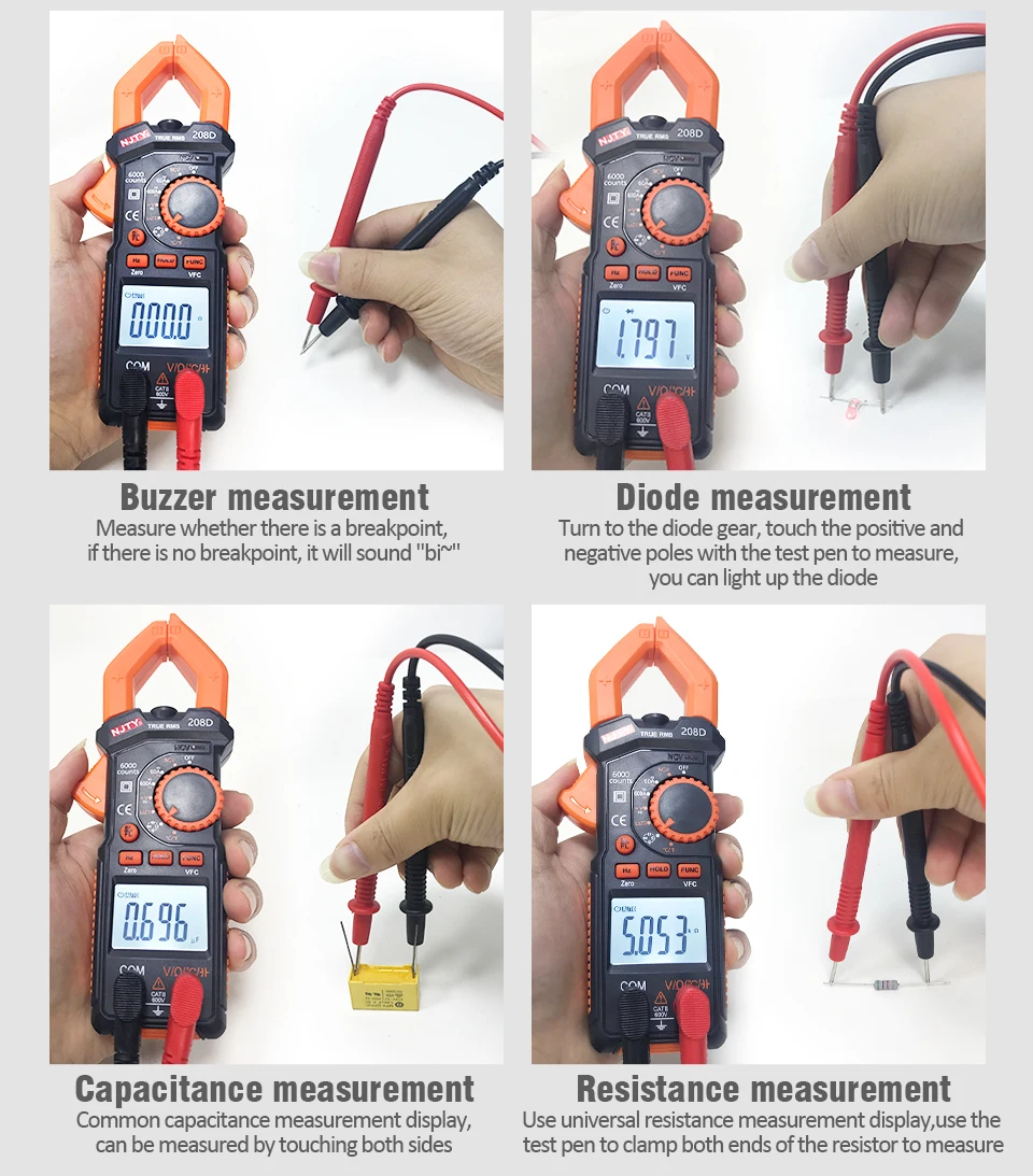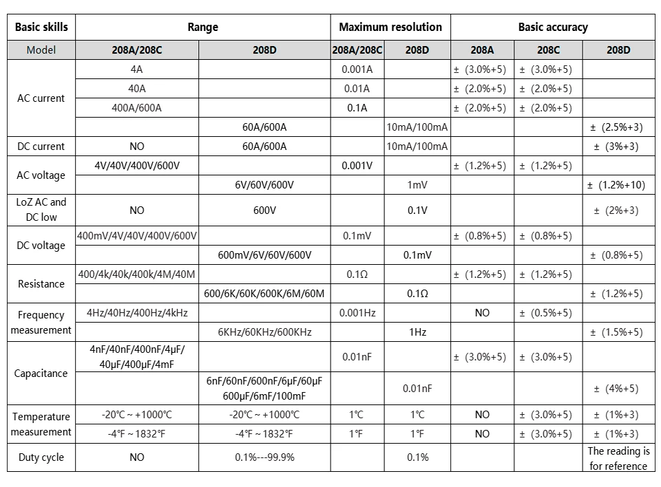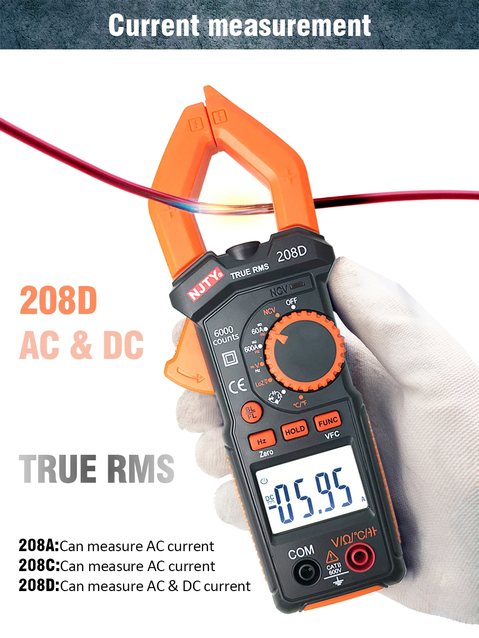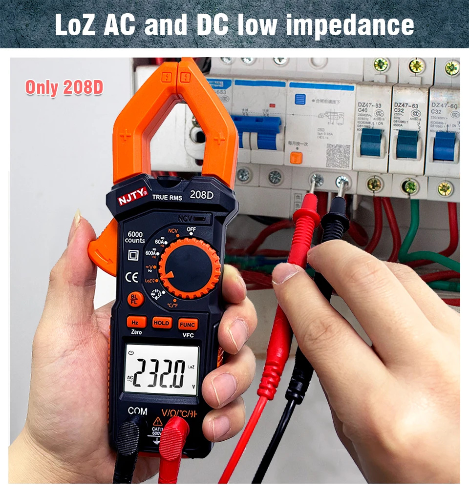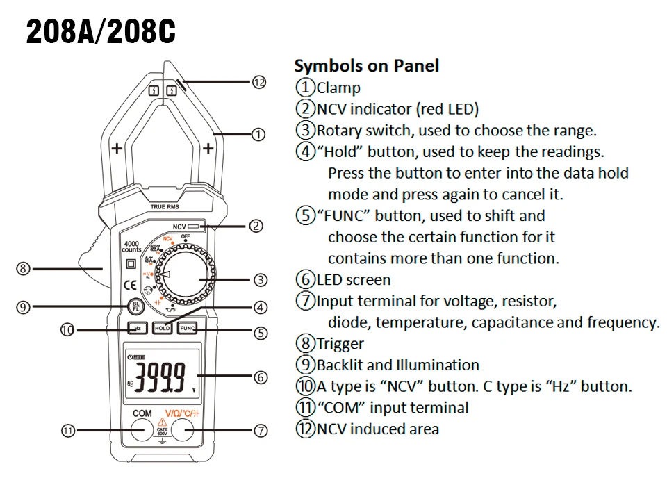 Этот зажим серии NCV включает в себя 2 модели, они называются в 208A и 208C. Ток переменного тока 1. Диапазон измерения (3999 цифр): 0.1A 600A