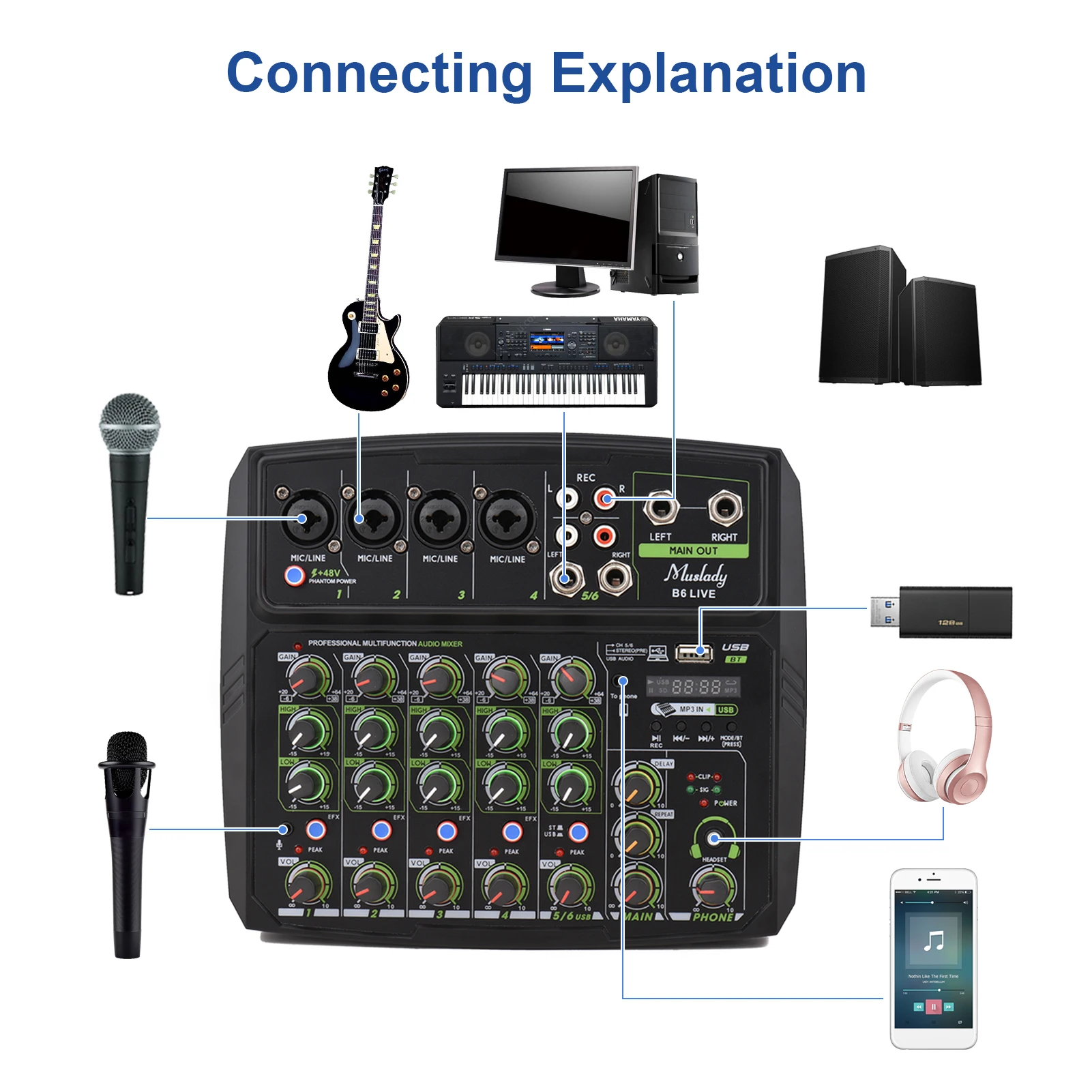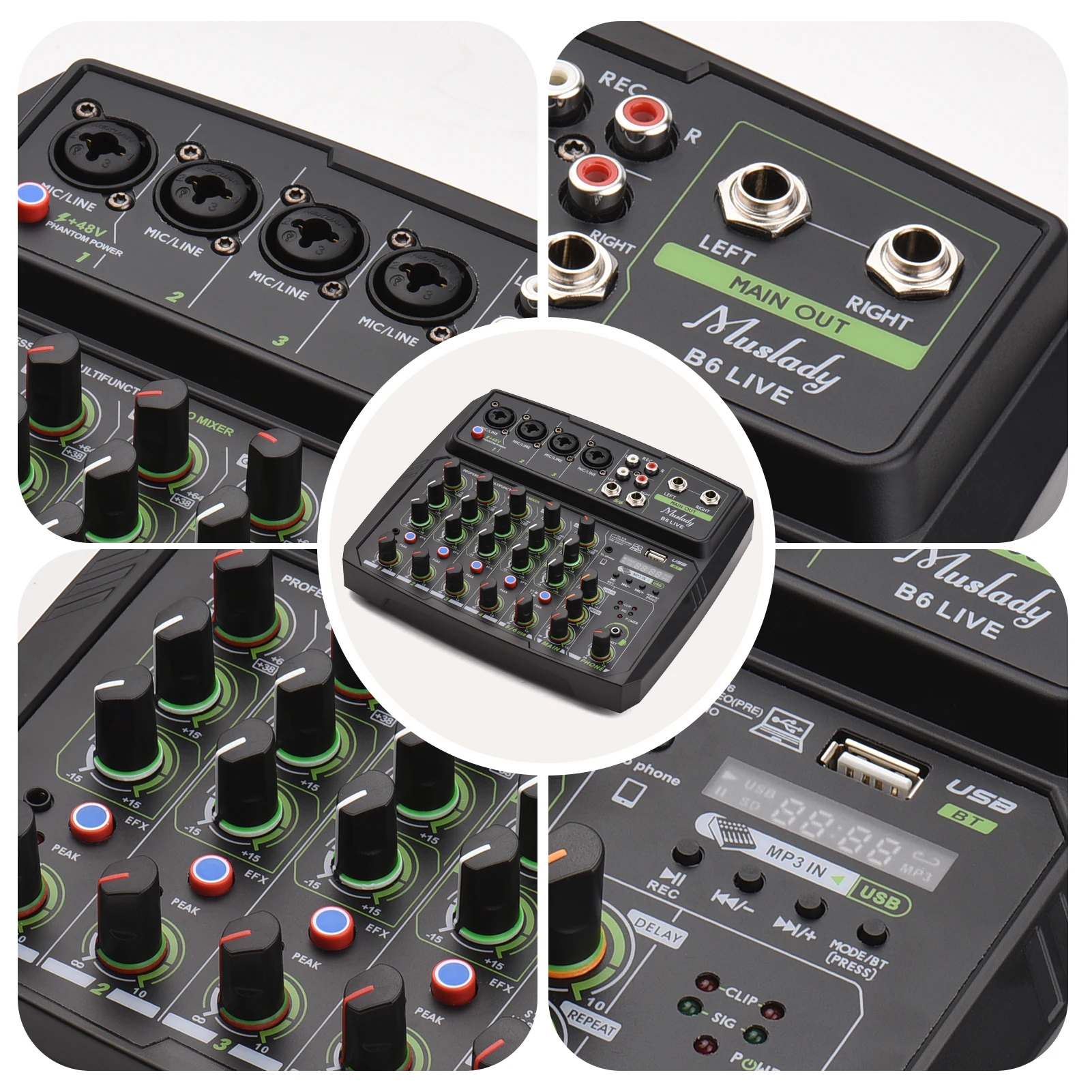 Портативный 6-канальный смеситель: мульти-функциональный 6 микшер каналов консоль с звуковая карта функция, поддержка BT и usb-подключением, 3,5 мм выход для наушников, микрофона и разъем для наушников.