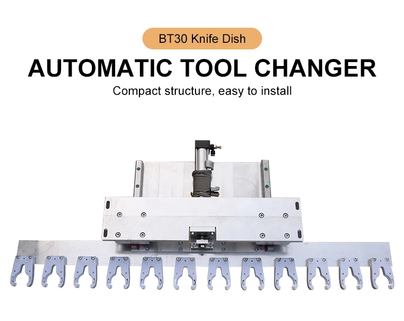 Product name: automatic inline tool change Tool magazine: 8/10/12 tool magazine Tool clip model: BT30 Linear guide rail :HGH25CA Cylinder: SU32x150S ●The cutter head seat is processed as a whole, with high positioning accuracy ●Compact structure, easy to install and control