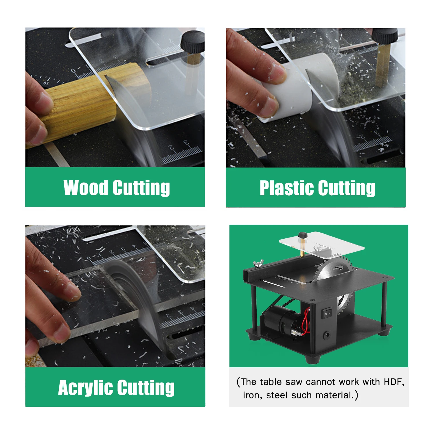 Эта Бытовая пила для стола прочная, портативная, практичная и простая в использовании. Также оснащен двигателем высокой мощности, он может достигать высокой скорости резания 3000 об/мин для резки дерева, пластиковой доски, акриловой доски и многого другого с эффективностью. Сделать работу по резке проще.