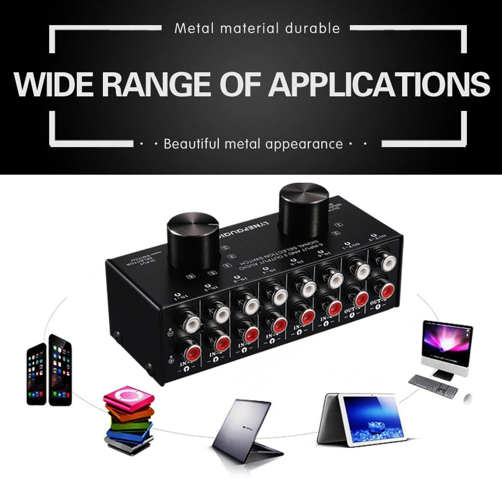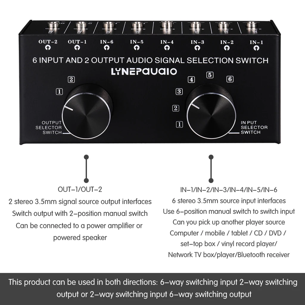 6 в 2 или 2 в 6 из стерео переключатель источника звука на выбор сигнала; Продукт не имеет конструкции источника питания, прямого подключения, передачи без потерь входных и выходных сигналов; В основном используется для выбора и переключения различных стерео сигнальных входов и совместного использования одного или нескольких наборов оборудования, таких как несколько источников стерео сигнала (ТВ аудио, MP3-плееры, CD плееры, видеоигры, мобильные телефоны, планшеты, компьютеры, фоноплееры), И т. Д. Оборудование должно быть выходным на усилитель мощности или активные динамики; Шестиканальный переключатель аудио на выбор сигнала решает сложную линию подключения и отключения операций, и вы можете легко и удобно выбрать, подключив источники сигнала оборудования, которые должны быть включены в коммутатор; Вход и выход продукта утвердить стандарт RCA Интерфейс дизайн (по желанию: стандартный 3,5 мм интерфейс), и переключатель принимает точную 6 позиций и 2-х позиционный ручной переключатель дизайн. 6 в 2 или 2 в 6 из стерео переключатель источника звука на выбор сигнала; Продукт не имеет конструкции источника питания, прямого подключения, передачи без потерь входных и выходных сигналов; В основном используется для выбора и переключения различных стерео сигнальных входов и совместного использования одного или нескольких наборов оборудования, таких как несколько источников стерео сигнала (ТВ аудио, MP3-плееры, CD плееры, видеоигры, мобильные телефоны, планшеты, компьютеры, фоноплееры), И т. Д. Оборудование должно быть выходным на усилитель мощности или активные динамики; Шестиканальный переключатель аудио на выбор сигнала решает сложную линию подключения и отключения операций, и вы можете легко и удобно выбрать, подключив источники сигнала оборудования, которые должны быть включены в коммутатор; Вход и выход продукта утвердить стандарт RCA Интерфейс дизайн (по желанию: стандартный 3,5 мм интерфейс), и переключатель принимает точную 6 позиций и 2-х позиционный ручной переключатель дизайн.