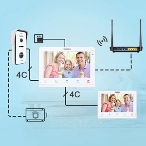 10 ''монитор может подключать более 3x7'' slave мониторы и 2 Дверных звонка. Все мониторы могут видеть, слышать, говорить с наружной камерой и разблокировать дверь.