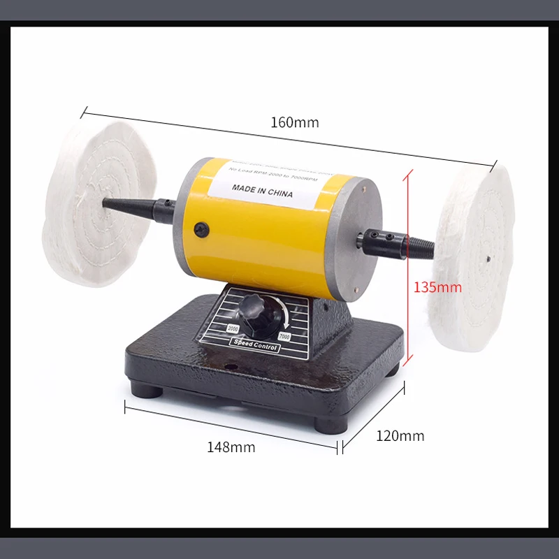 Стоматологическая скамья полировщик токарный станок тихий двигатель шлифовальный полировальный станок лабораторное оборудование Особенности ● Стоматологическая полировальная машина является мини-типом, который требует небольшого пространства на скамейке. ● Высокоэффективный мини-токарный станок с максимальной скоростью 7000 об/мин, управляемый передним циферблатом. ● Переменная скорость Технические характеристики Напряжение: 100-120 В/60 Гц, 220-240 В/50 Гц Мощность: 200 Вт Скорость вращения: 2000-7000 об/мин Диаметр шлифовального колеса: 110 мм Детали: гаечный ключ, 4-1/4 "буффинг колеса x2 Использование: Полировка ювелирных изделий, протез и т. Д.