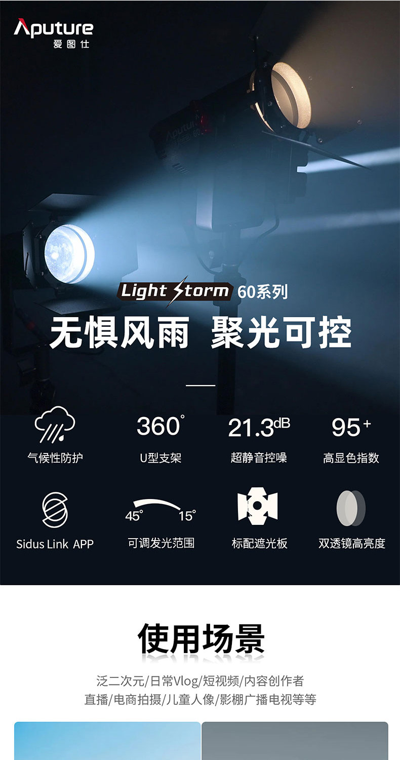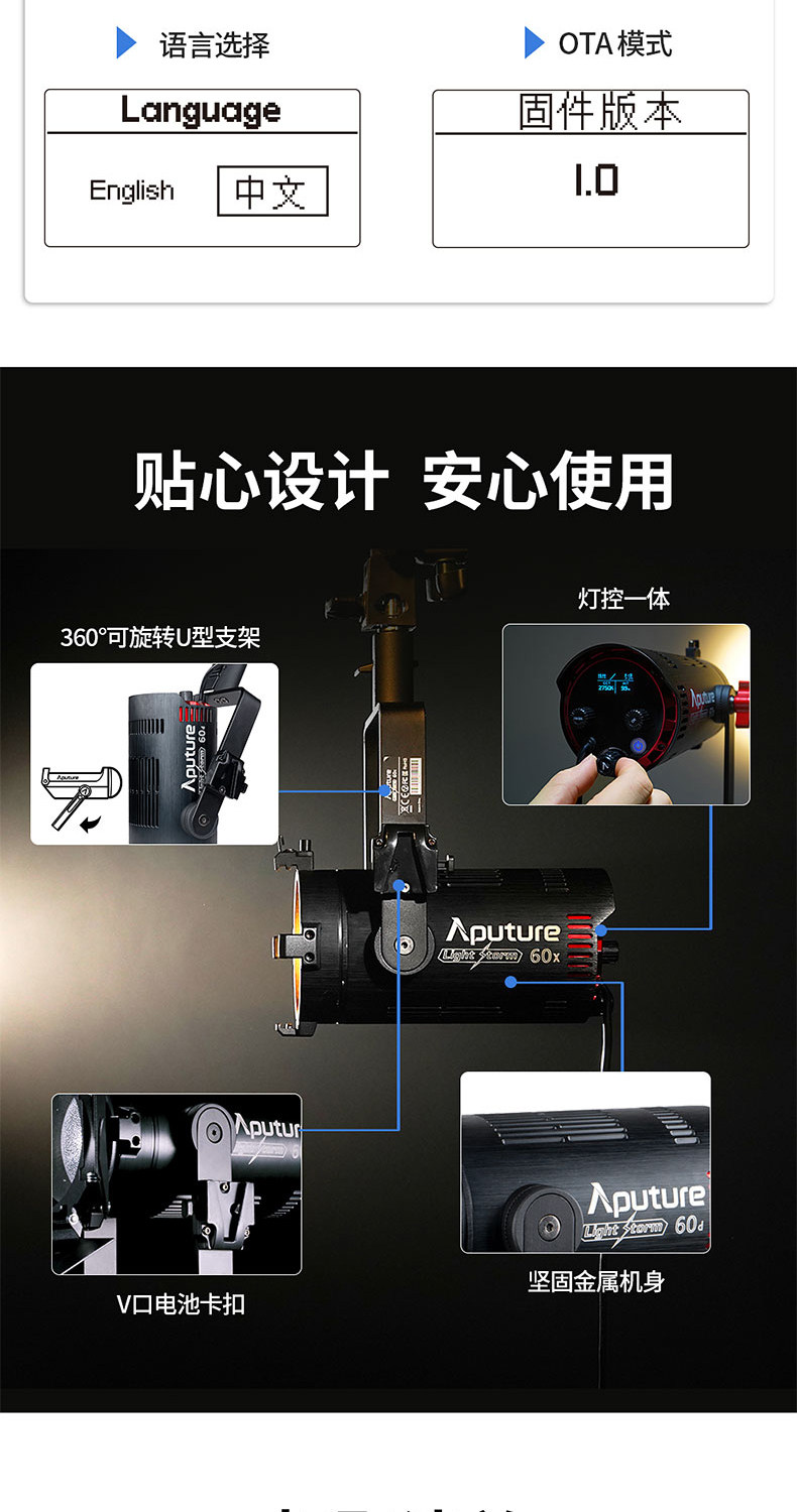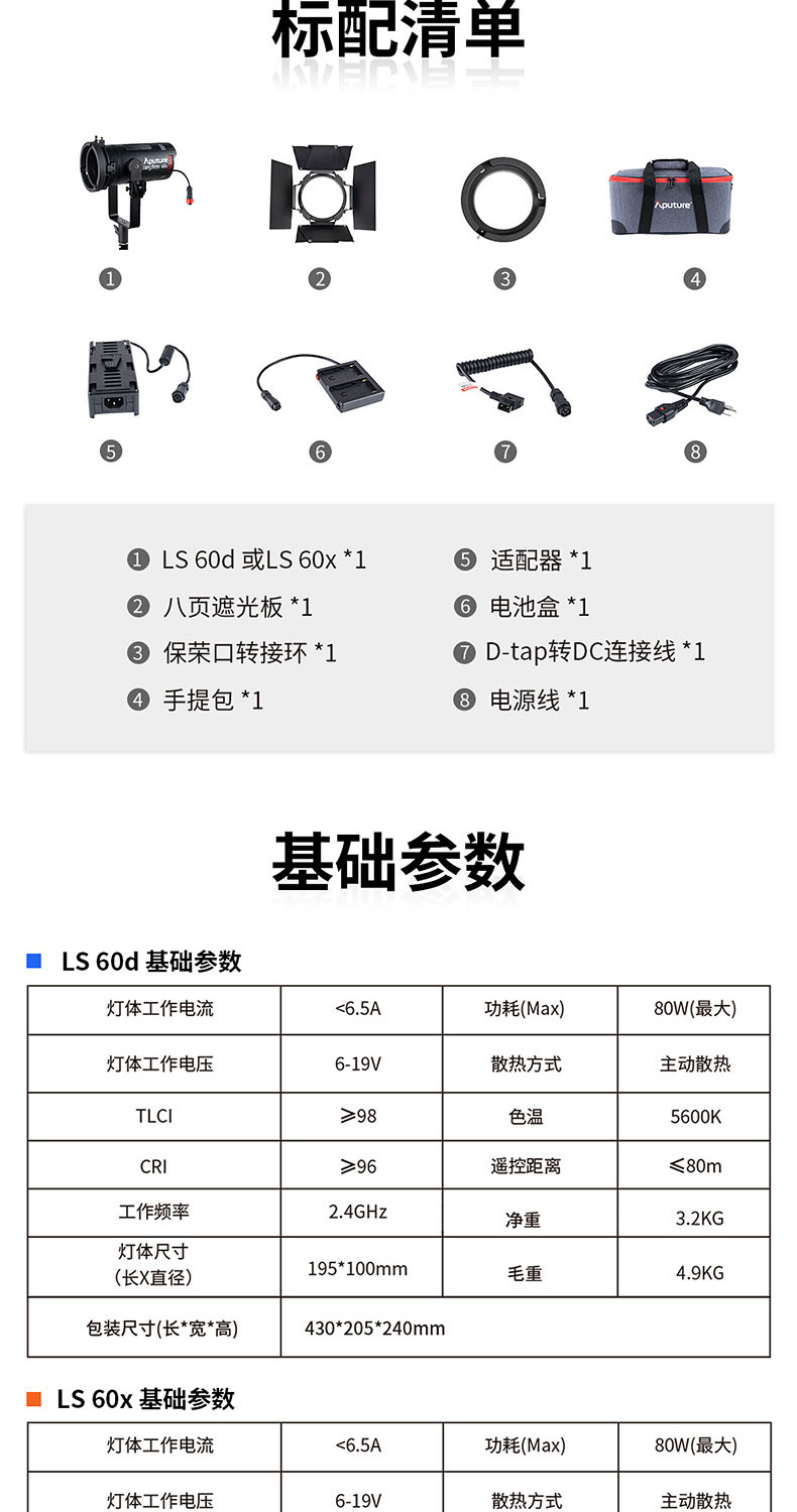 The Aputure LS 60d is a series of light storm brand new design with its own optical system lamps. The lamp integrates a new lens design to greatly improve the optical quality and texture of low-power light sources. Compact structure design, metal lamp body, excellent texture.IP64 level waterproof design, to meet more severe use scenarios.